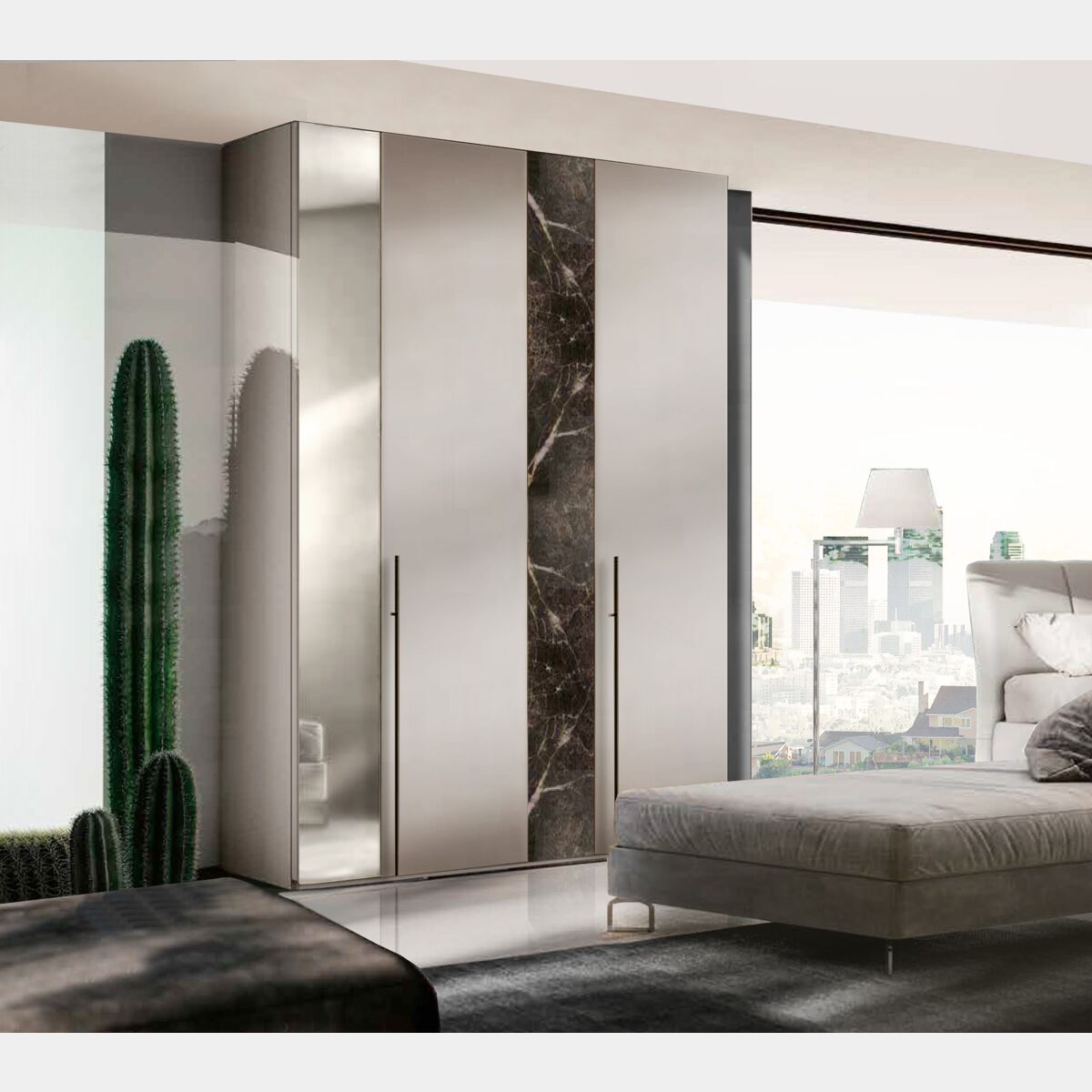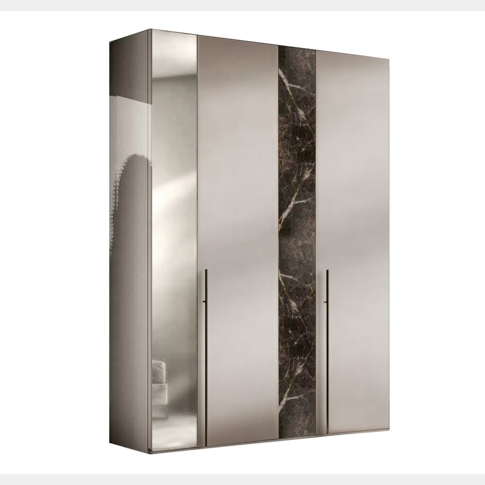 Armadio battente 4 ante con anta a specchio, in finitura Marmo nero e Grigio seta