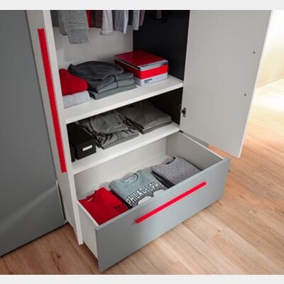 Le finiture proposte per l'armadio sono laccato Grafite, laccato Ciliegia e nobiliato bianco. Grazie ad un'ampia gamma di finiture è possibile creare una soluzione personalizzata che si adatti al 100% alla cameretta del bambino, assicurando così un arredo unico e originale.