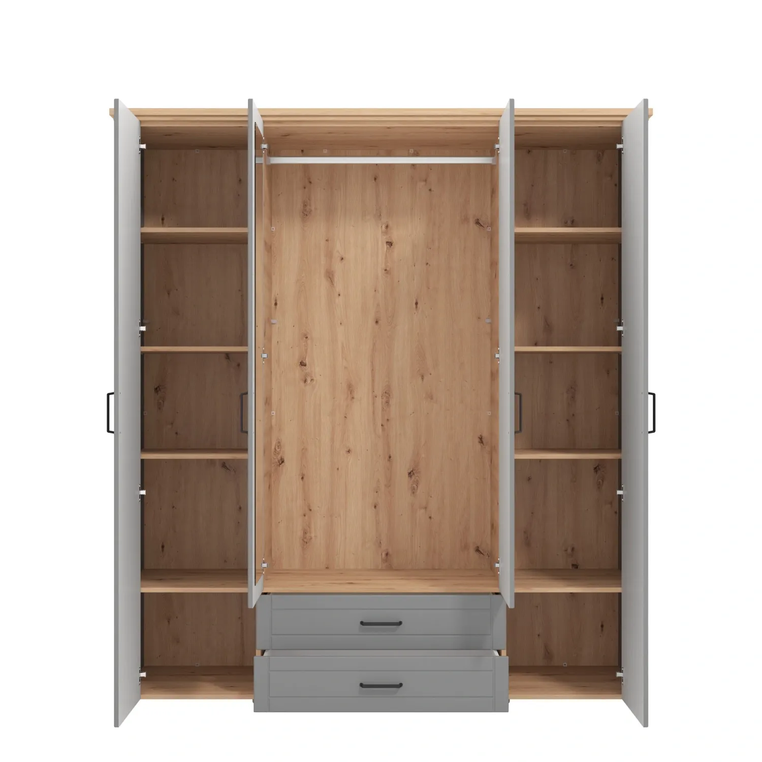 Le quattro ante battenti nascondono numerosi ripiani ed un tubo appendiabiti. Nell'anta centrale è previsto inoltre uno specchio interno.