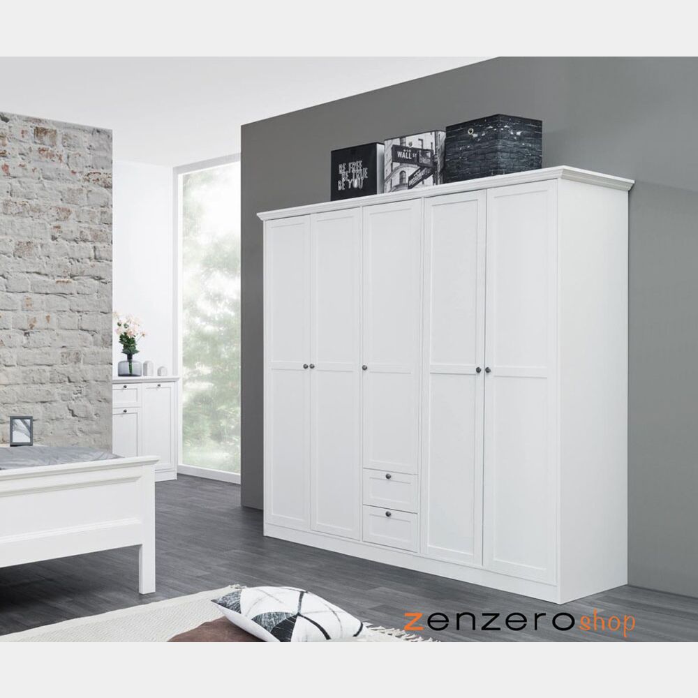 Armadio battente di design con 5 ante e 2 cassetti, finitura biancaArmadio di design, adatto camere da letto matrimoniali e non, composto da 5 ante battenti e 2 cassetti.Design funzionale per un arredamento informale e di sicuro impatto. L'armadio è nella finitura bianca ed è a 5 ante e 2 cassetti.