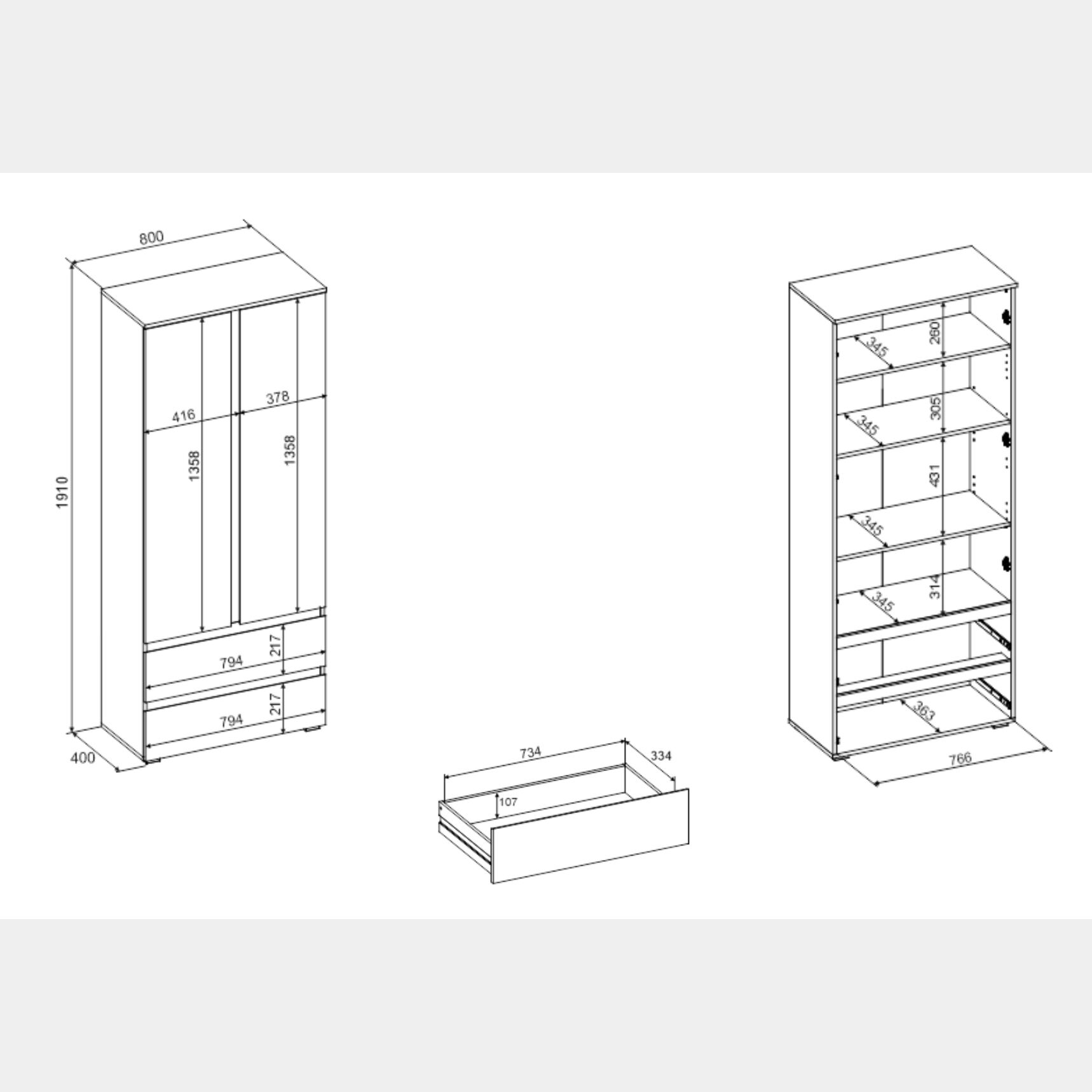 L'allestimento interno prevede 3 funzonali ripiani. A completare l'armadio sono 2 capienti cassettoni posti nella parte sottostante.