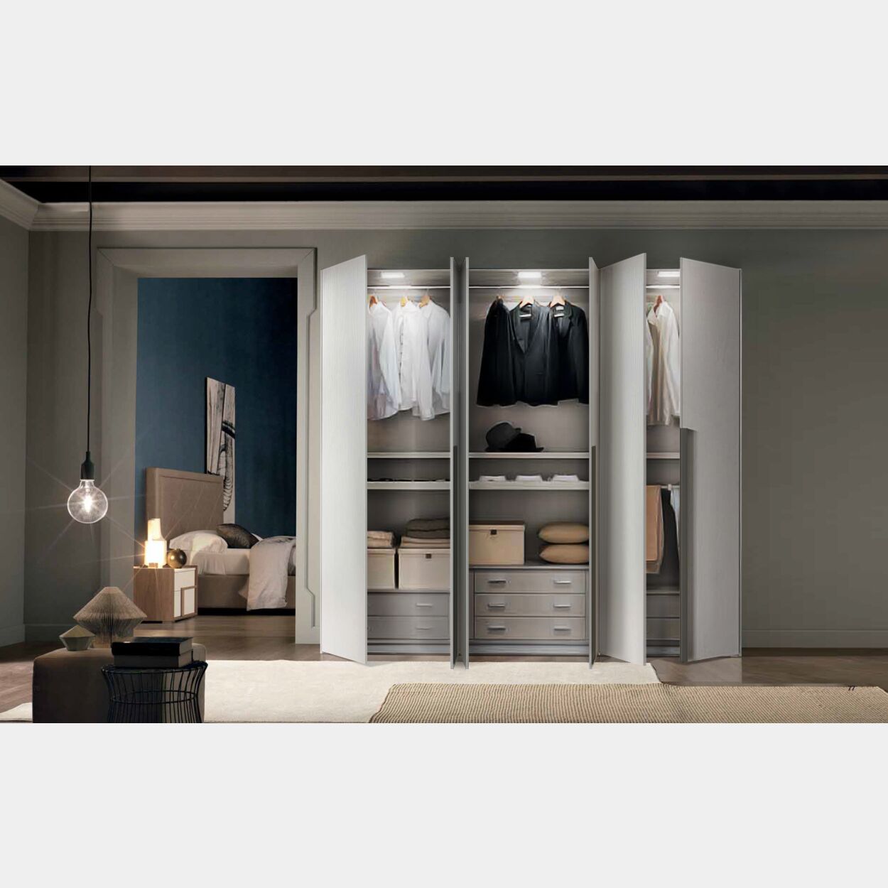 L'allestimento di base prevede 1 ripiano e 2 tubi appendiabiti per vano, in totale verranno forniti quindi 3 ripiani e 6 tubi. E' possibile personalizzare la composizione interna per adattare al meglio l'armadio alle proprie esigenze, sono infatti disponibili altri ripiani, cassettiere a 2 o 3 cassetti, servetto, portapantaloni, portacravatte e illuminazione Led.