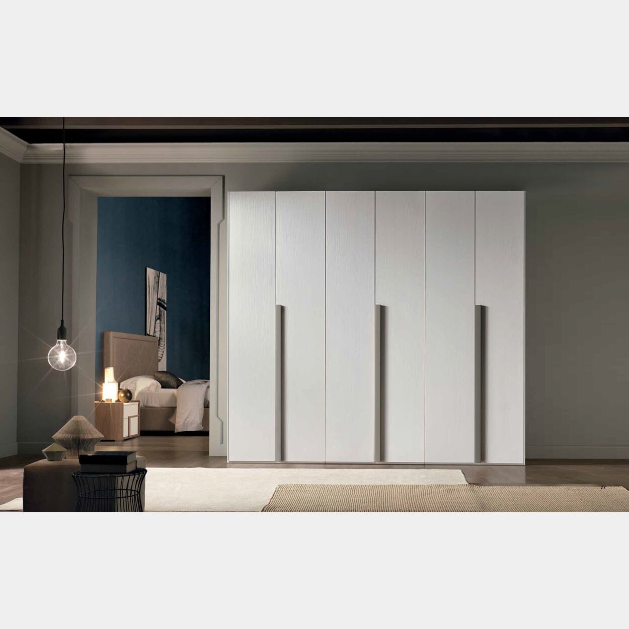 L'eleganza senza tempo del Noce bianco si fonde con il design moderno delle maniglie alte 130 cm: il risultato è un armadio estremamente raffinato e moderno. Le tipiche venature del materico garantiscono un impatto visivo unico creando leggere sfumature, il Grigio londra presente nelle pratiche maniglie si contrappongono al Noce per dare carattere all'armadio.