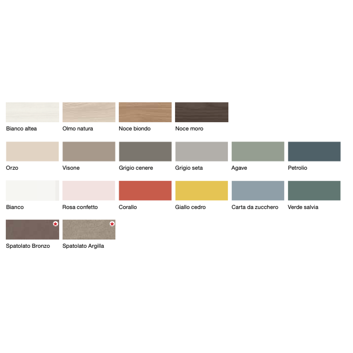 • Frontali: prodotto con pannelli a bassa emissione di formaldeide, certificati E1, spessore 18 mm. Ante predisposte di fori per maniglie, dotate di cerniere con clip ammortizzate , apertura a 110°C. Parabordo fornito di serie. Tubi appendiabiti in acciaio cromato a sezione ovale, 22x15 mm, fissaggio ai fianchi.