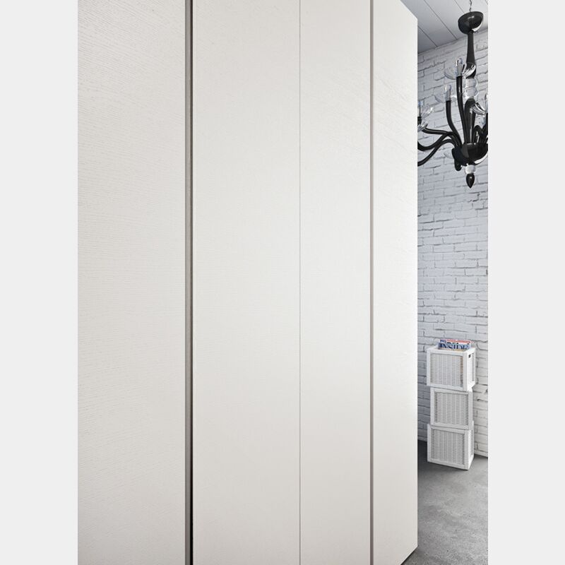 La finitura proposta è una delicata tonalità di Bianco frassinato, la presenza delle venature tipiche donando calore all'armadio, rendendo così la camera accogliente. E' possibile personalizzarlo scegliendo tra diverse tinte laccate oppure finiture materiche.