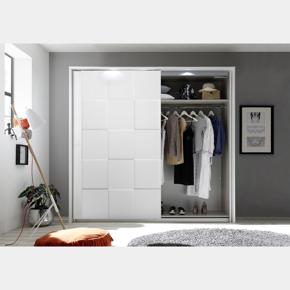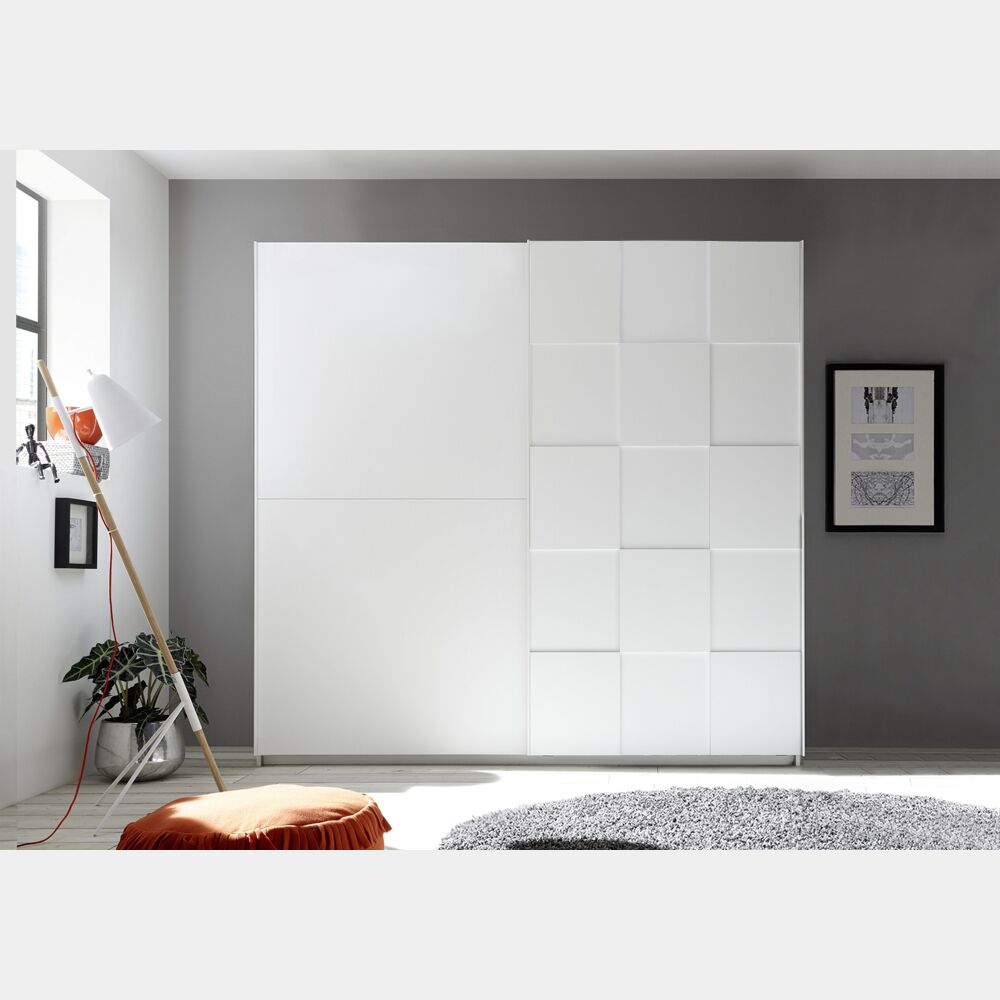 Armadio moderno 2 ante scorrevoli con forme geometriche, 220x210, bianco opaco