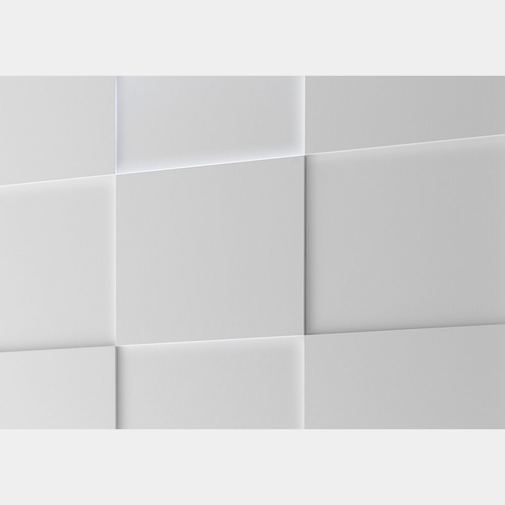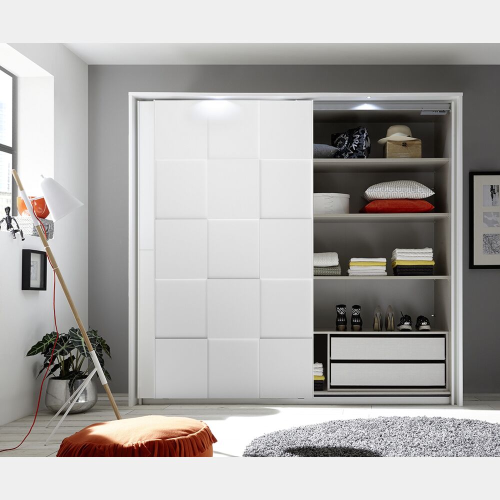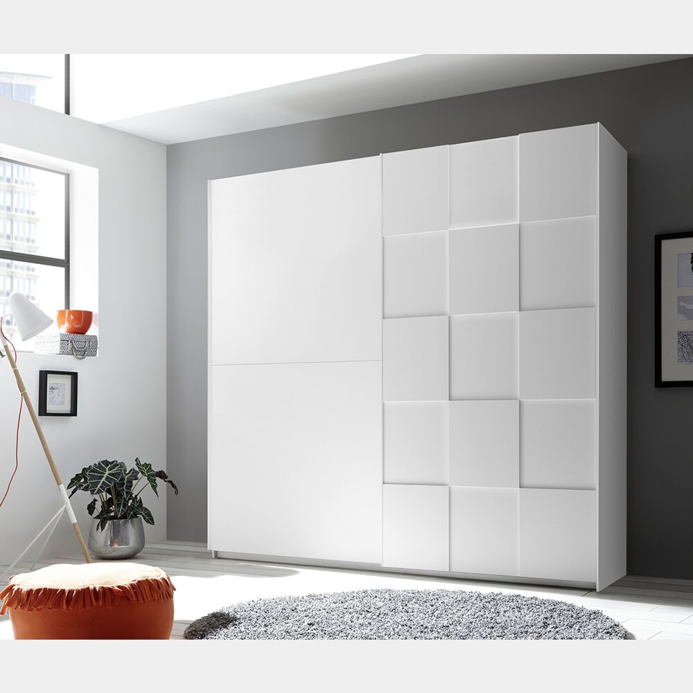 Armadio di design dalle linee pulite ampio e robusto. La finitura è bianco opaco per scocca ed ante; un'anta è lavorata con forme geometriche.