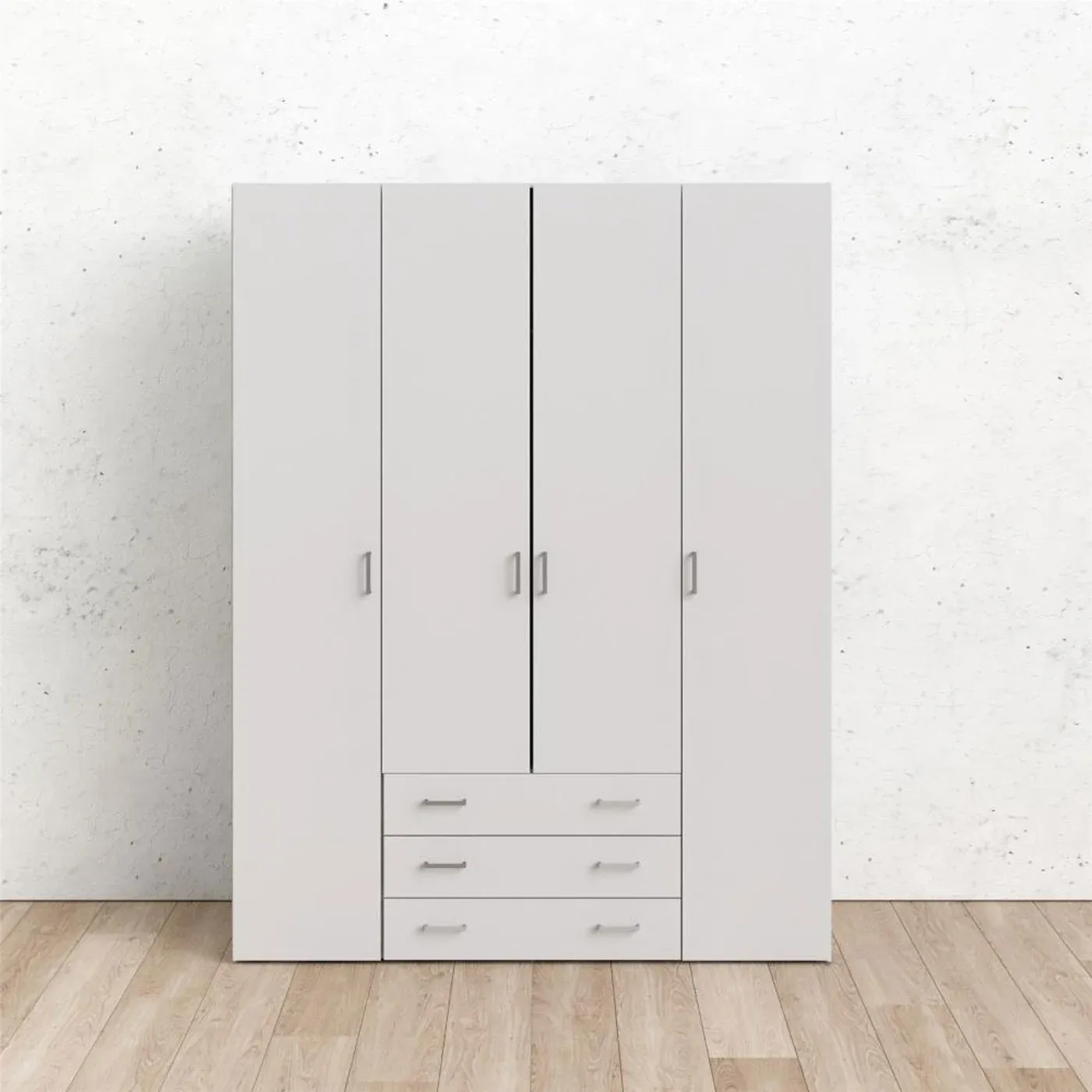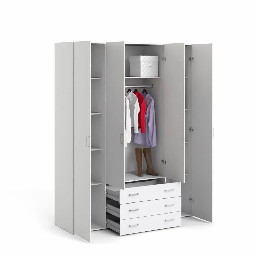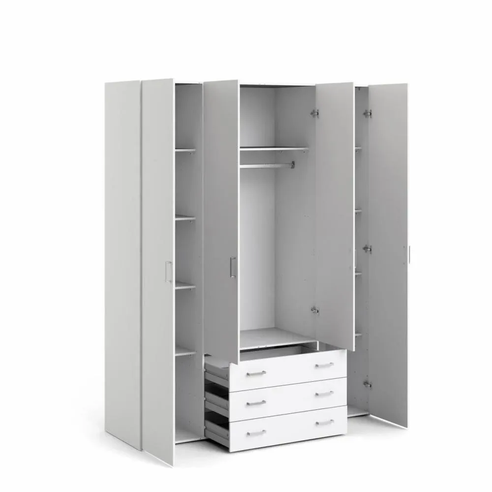 Elegante armadio in finitura Bianco con tre cassetti, quattro ante battenti, nove ripiani e un tubo appendiabiti. Il mobile è ben strutturato per contenere al meglio tutti i vostri vestiti in ordine. La grafica appartiene allo stile moderno e si rivela bello esteticamente da vedere nelle vostre camerette o camere da letto. Si può collocare anche in un garage come se fosse un armadio multiuso.