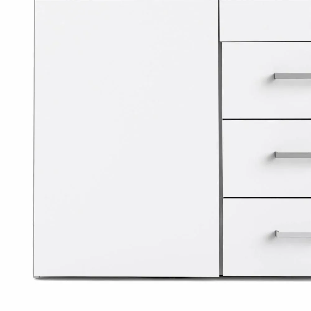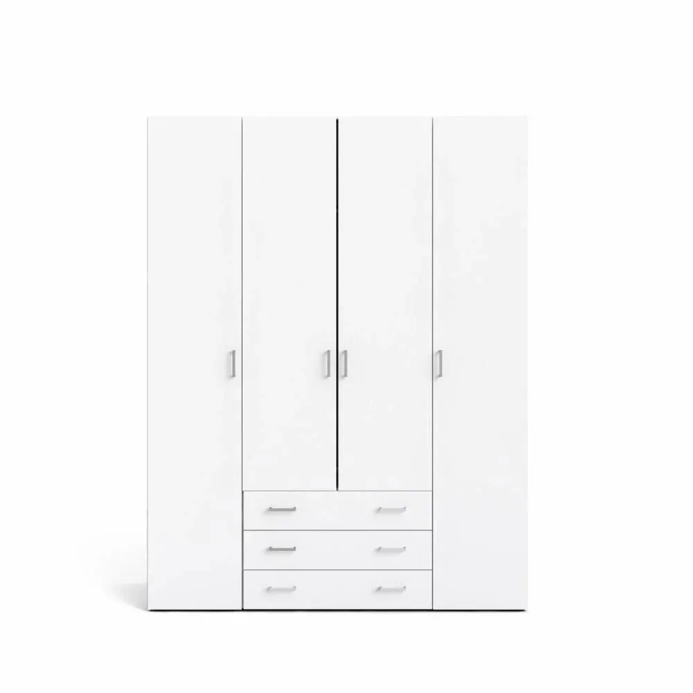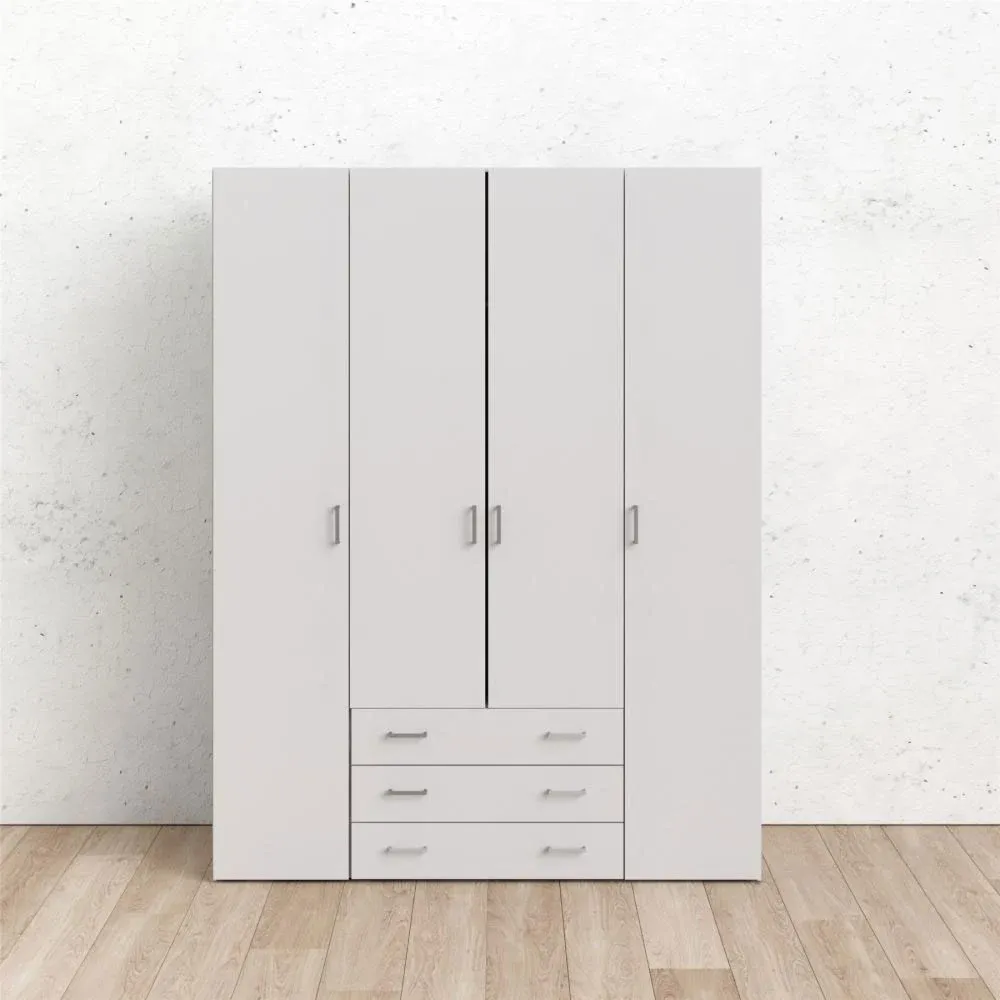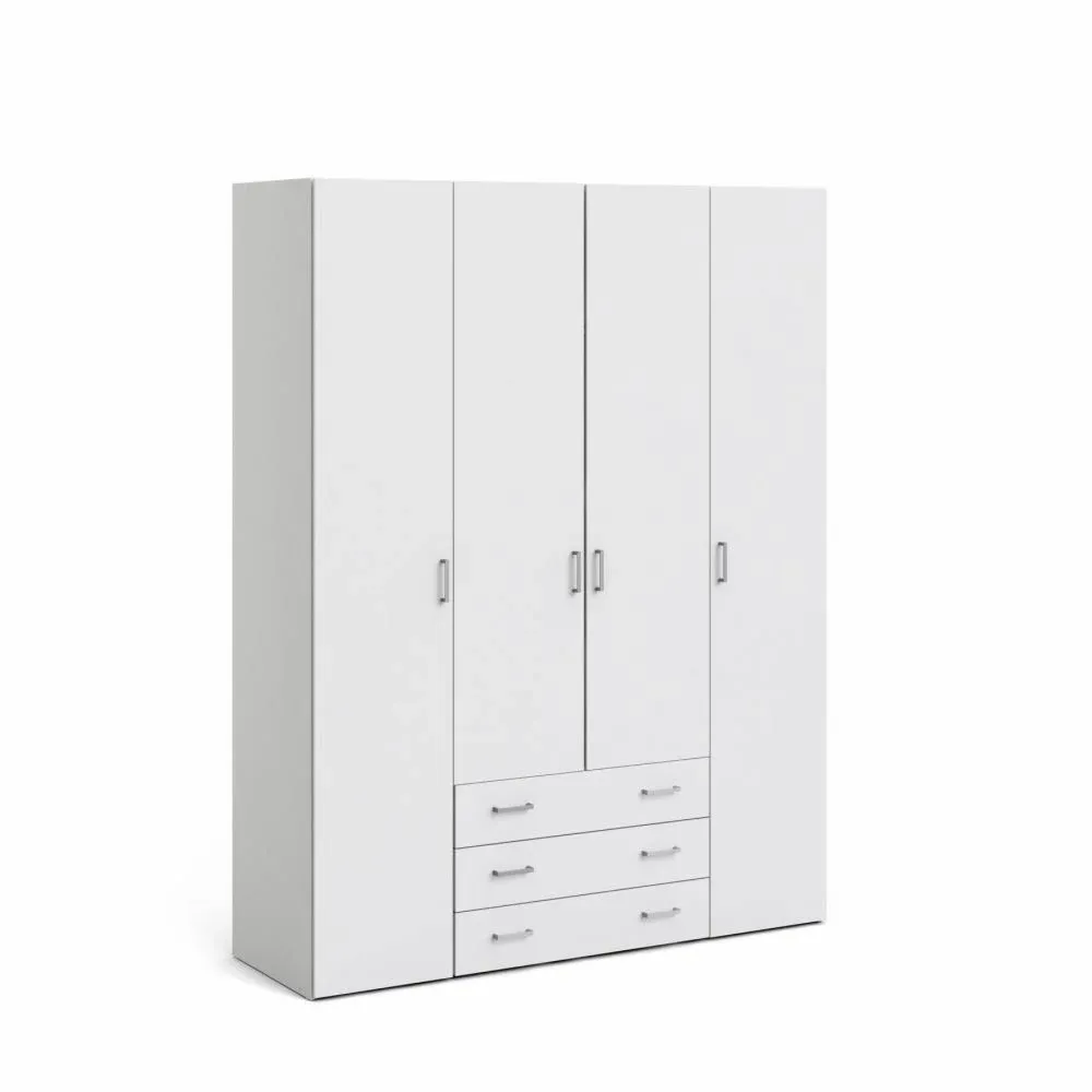 Elegante armadio in finitura Bianco con tre cassetti, quattro ante battenti, nove ripiani e un tubo appendiabiti. Il mobile è ben strutturato per contenere al meglio tutti i vostri vestiti in ordine. La grafica appartiene allo stile moderno e si rivela bello esteticamente da vedere nelle vostre camerette o camere da letto. Si può collocare anche in un garage come se fosse un armadio multiuso.