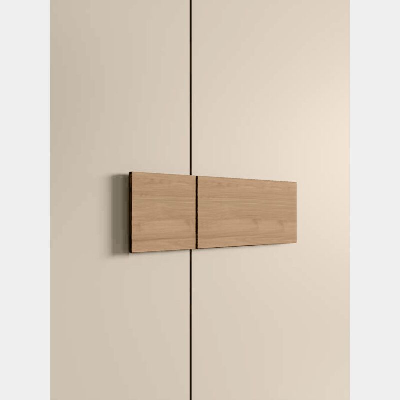 L'armadio presenta 8 ante battenti: le 4 laterali formano un vano di 120 cm, così come quello centrale. Le partiolari maniglie rettangolari lo rendono moderno e richiamano il vano tv reclinabile, posteriormente sono presenti 2 ripiani.