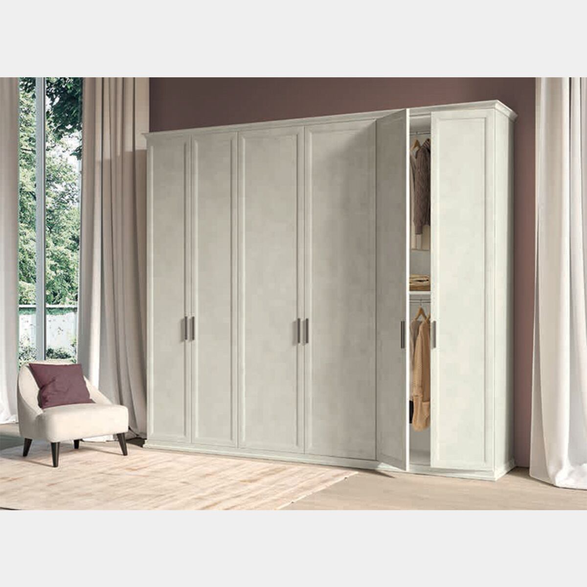 L'armadio presenta 6 ante battenti, l'allestimento di base prevede un ripiano e due tubi appendiabiti per vano, è però possibile configurare l'allestimento richiedendo ulteriori optional come porta scarpe o cravatte per adattarlo al megli alle proprie esigenze.