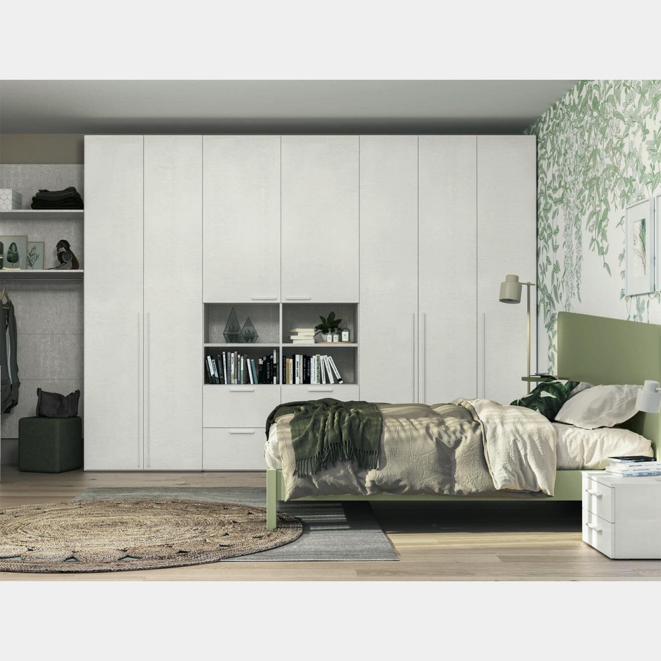 L'armadio presenta 7 ante scorrevoli in finitura Frassino bianco puro, 4 cassetti sempre nella stessa finitura e 4 vani a giorno. L'allestimento di base prevede 2 tubi appendiabiti e un ripiano per vano, in quelli minori è previsto un tubo appendiabiti.