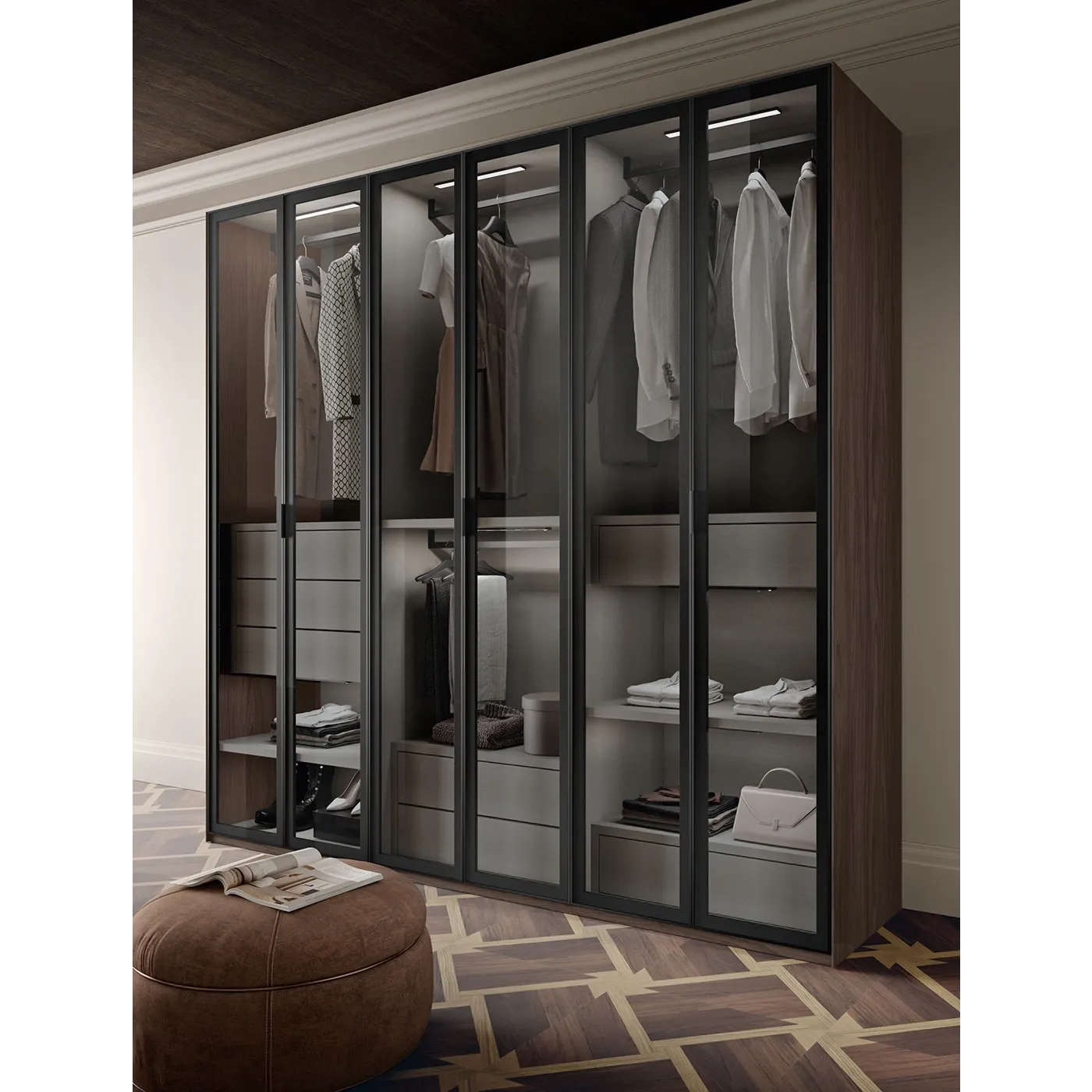 Tratto saliente dell'articolo sono le sue 6 ante, costituite da lastre di vetro trasparente che consentono di vederne gli interni e realizzati con pannelli di particelle di legno nobilitato con carta melaminica di spessore mm 18-30, con emissione di formaldeide classe E1 e con il profilo ligneo verniciato di Nero.
