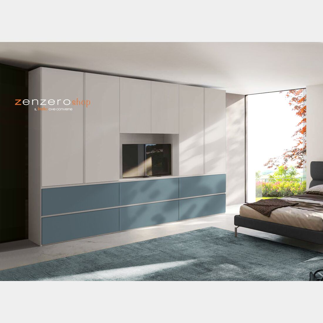 Armadio con 6 ante battenti e 6 cassetti in finitura Grigio seta e Petrolio