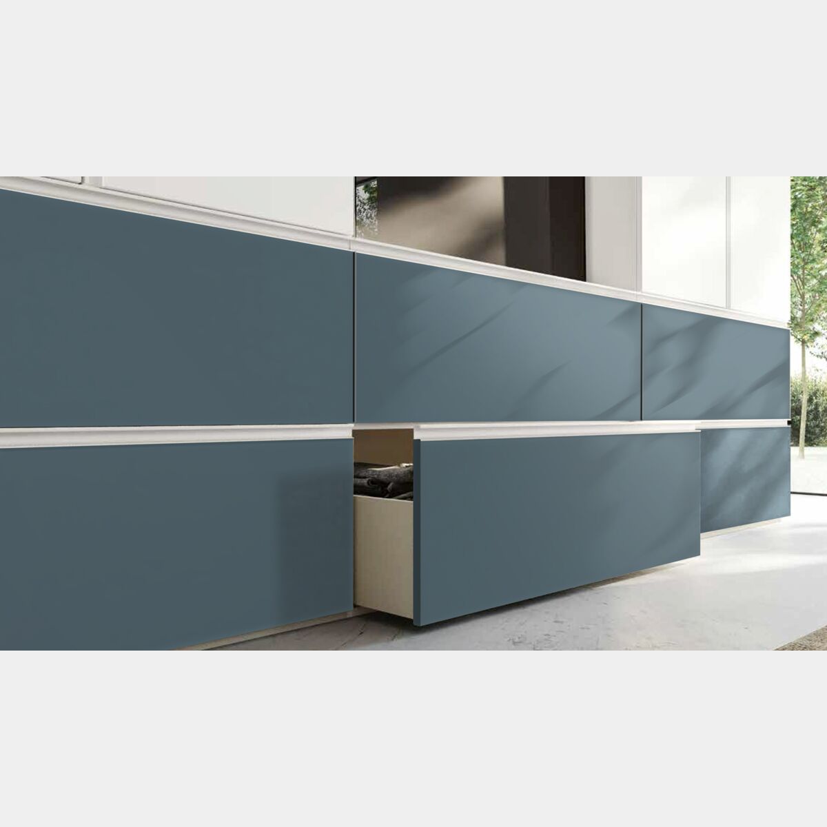 Le finiture proposte sono Grigio seta per le ante e Petrolio per i frontali, queste tonalità assicurano un armadio che diventa protagonista della camera da letto, catturando l'attenzione di chiunque.