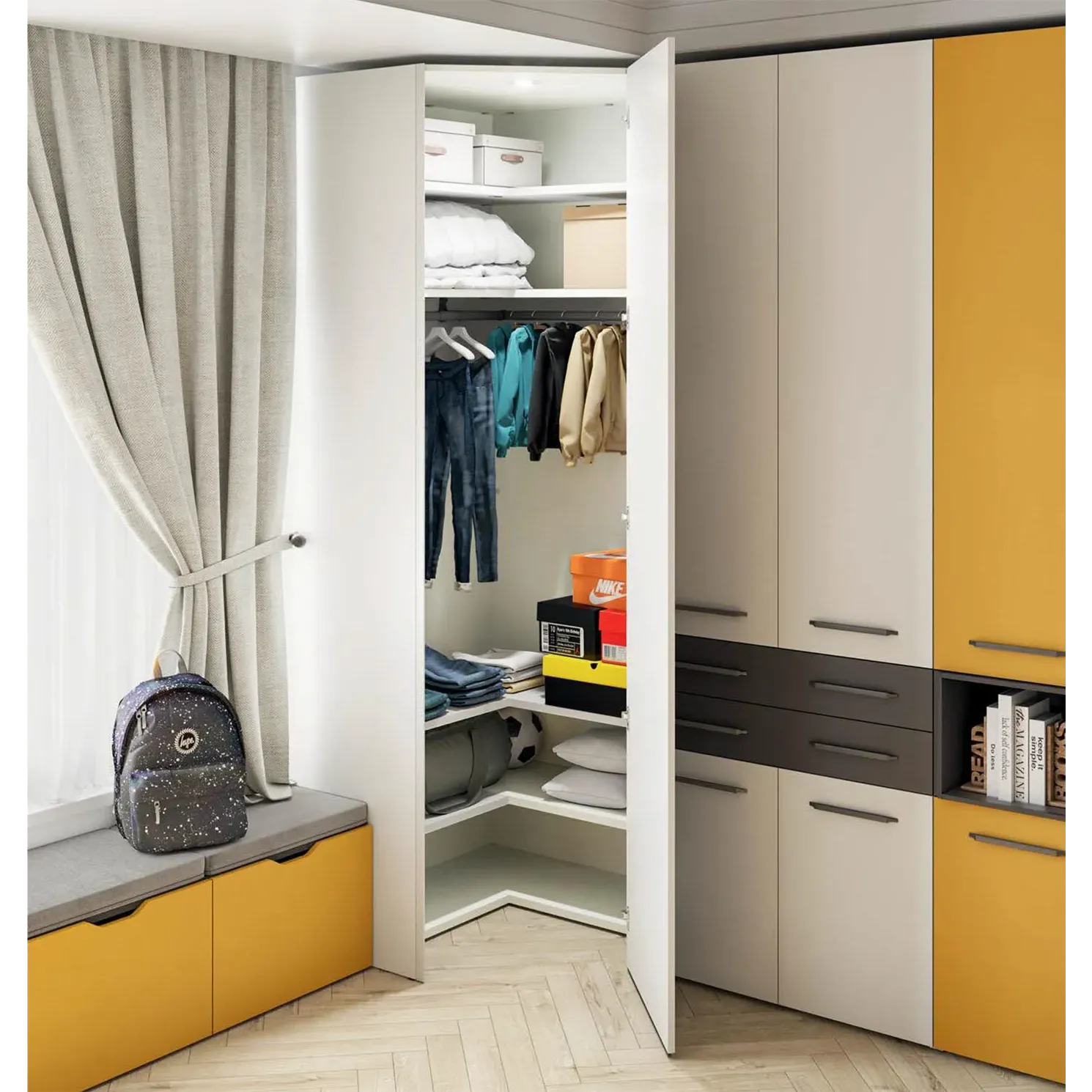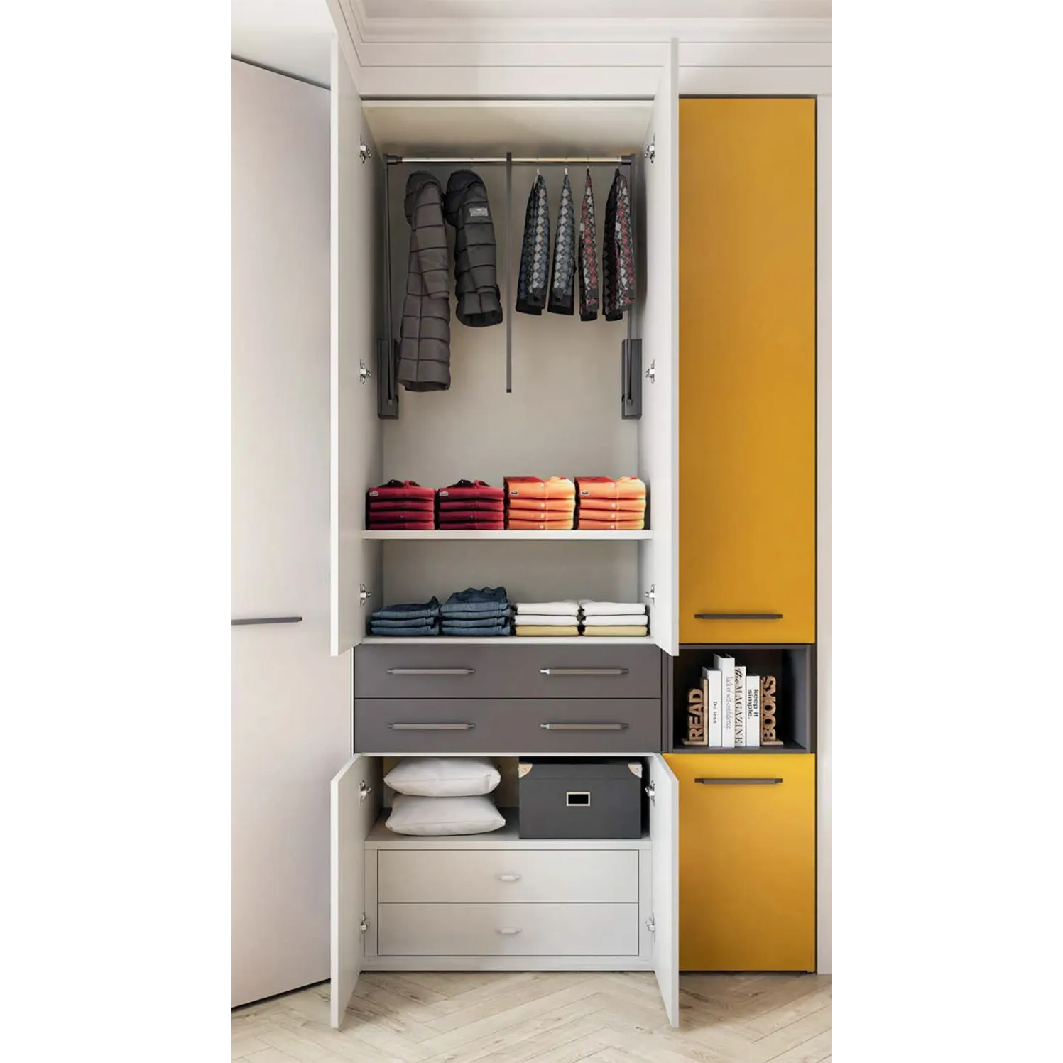 Armadio con cabina e cassetti, finitura Bianco luce, Antracite e Ocra