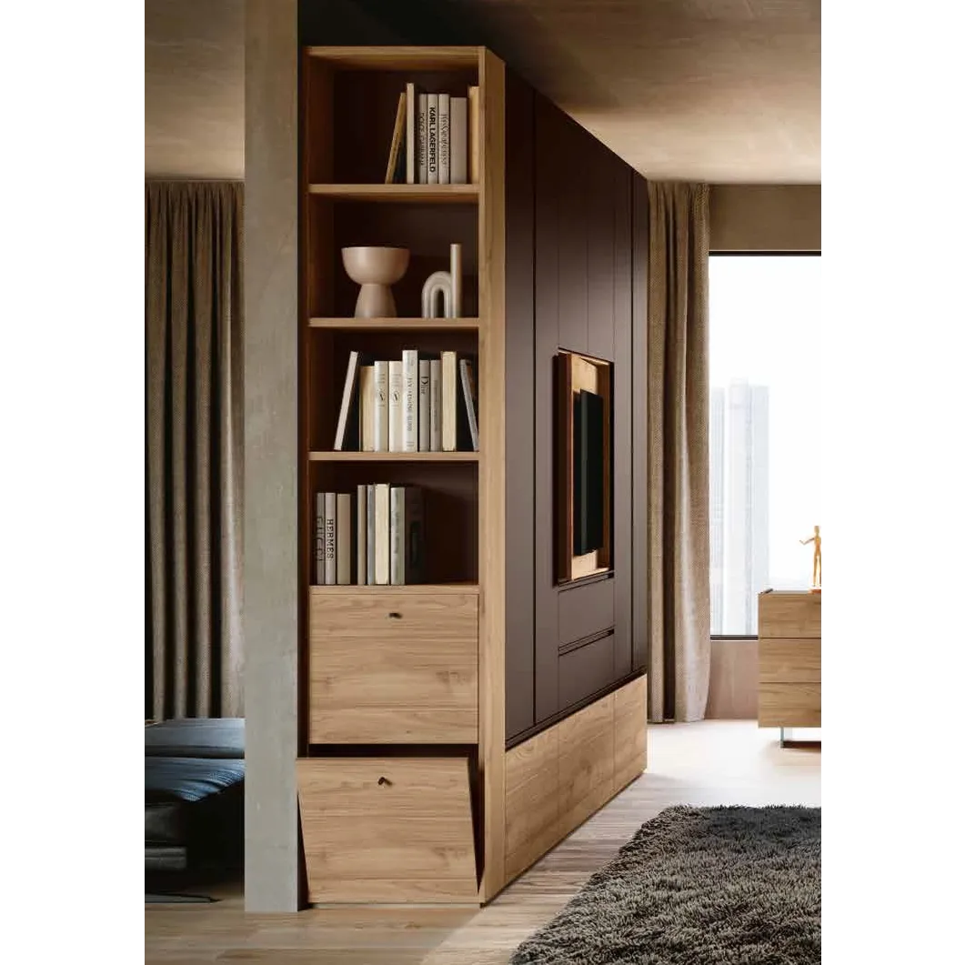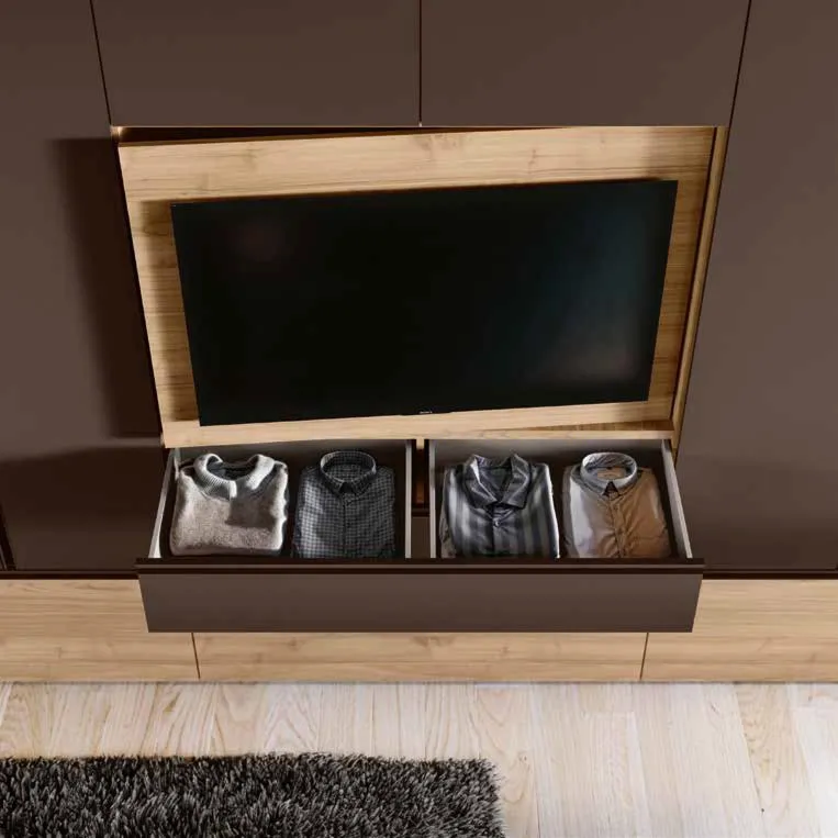 Progettato per offrire comfort e praticità nella zona notte l'armadio offre tutto ciò di cui si ha bisogno: spazio contenitivo per vestiti suddiviso in ante, cassetti e cestoni, un pannello girevole per collocare la tv ed una libreria terminale con due ante portascarpe.