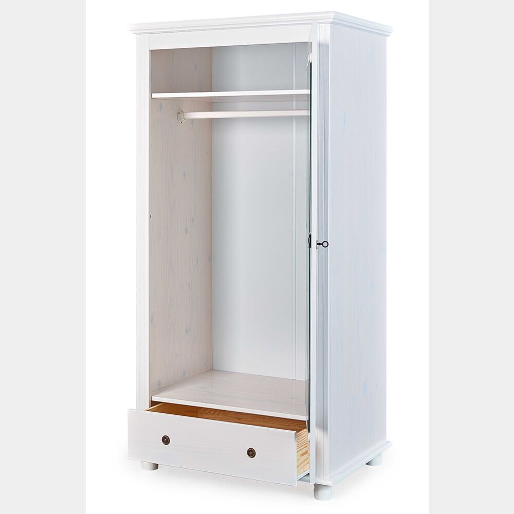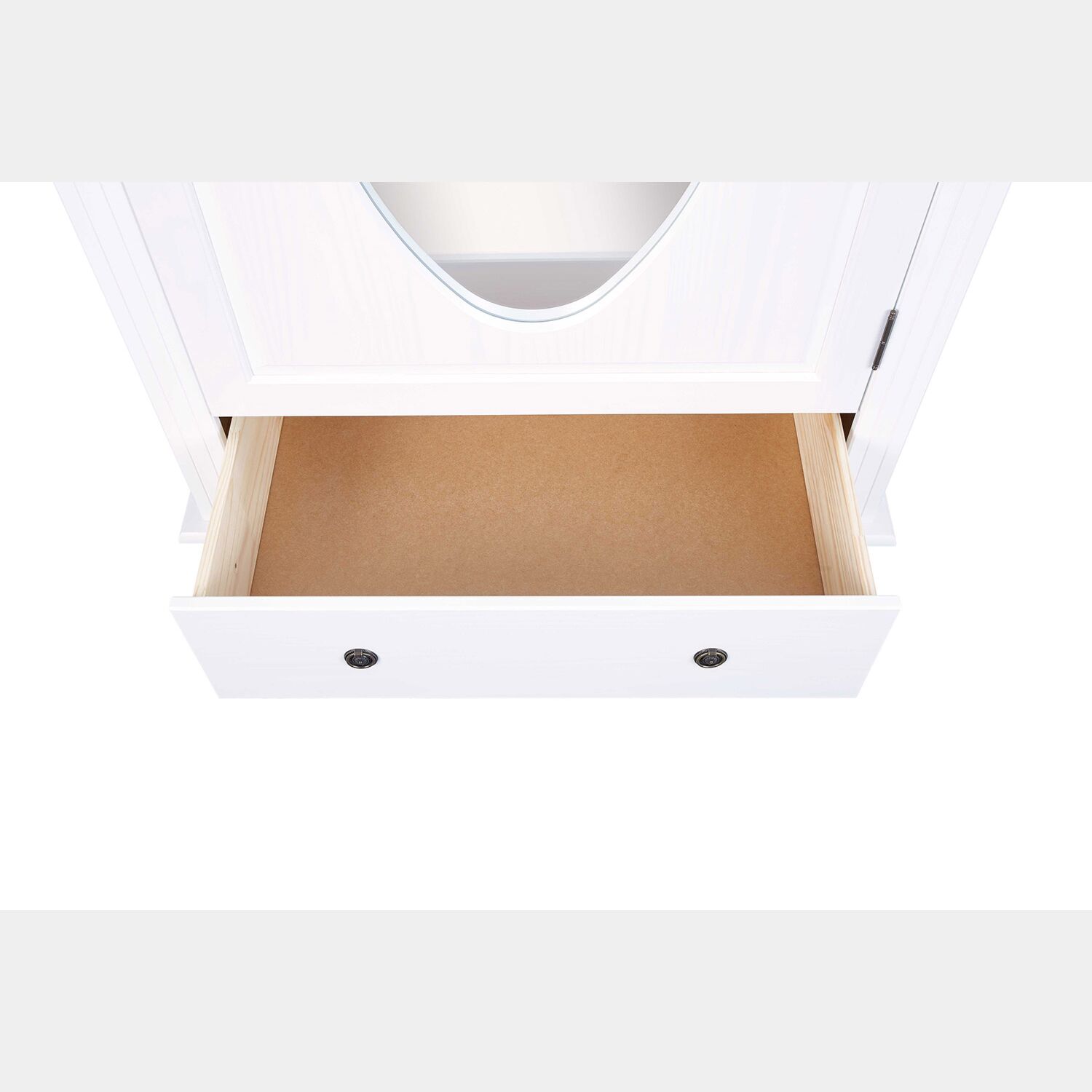 Questo armadio è dotato di un cassetto e un'anta in cui è presente uno specchio ovale. Viene fornito con un ripiano superiore e un tubo appendiabiti. E' dotato di una chiave che permette una chiusura sicura del mobile.
