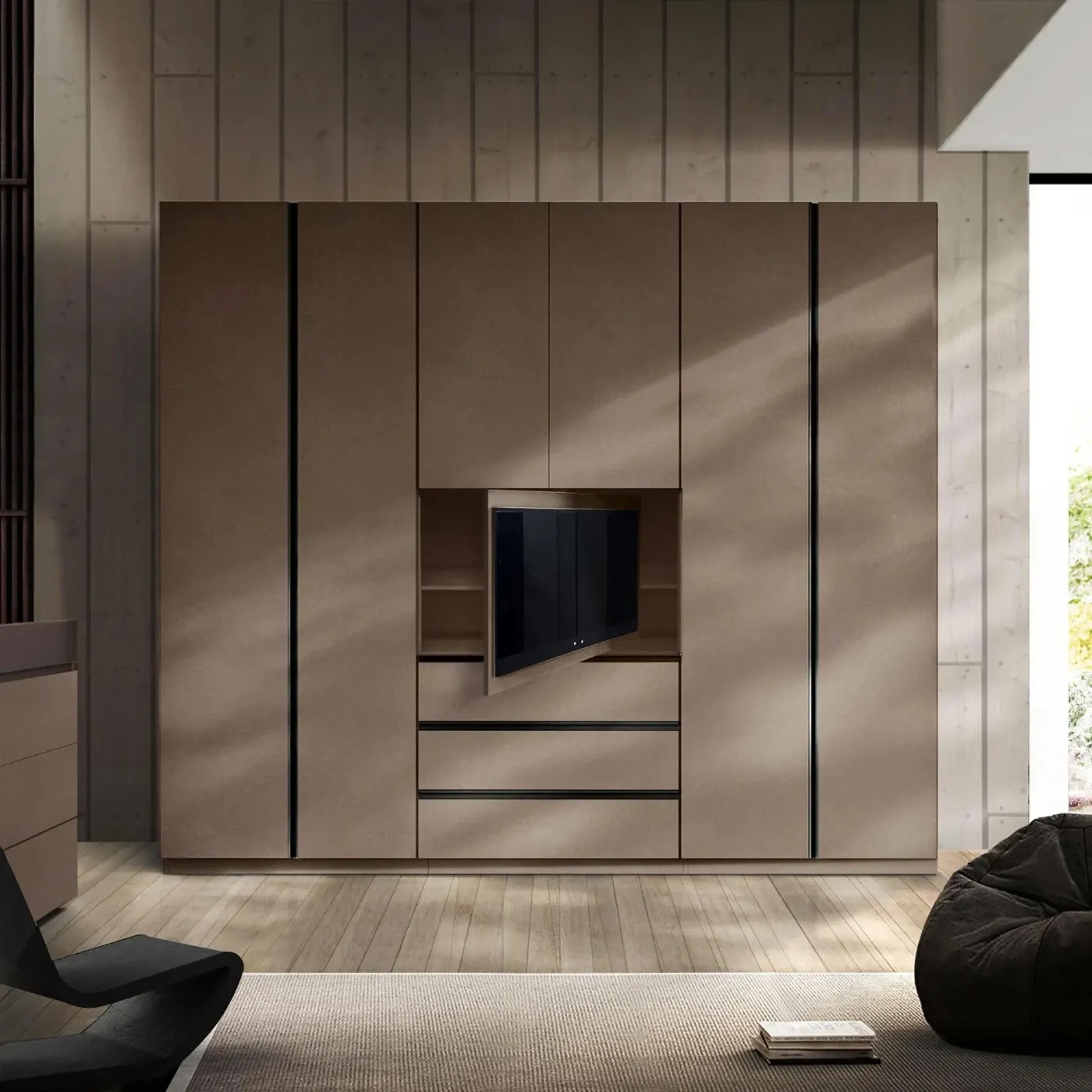Al centro si trova un'area dedicata all'intrattenimento, con un pannello TV girevole, che permette di orientare lo schermo.