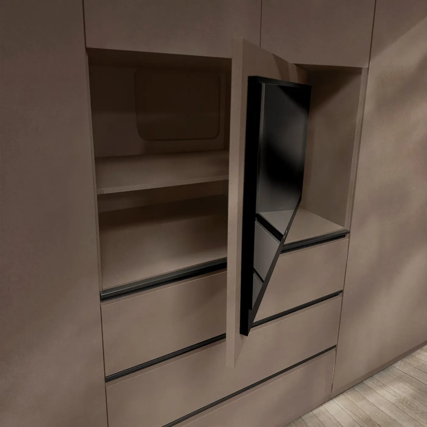 Sotto l'area TV, sono integrati tre ampi cassetti con maniglie Antracite.