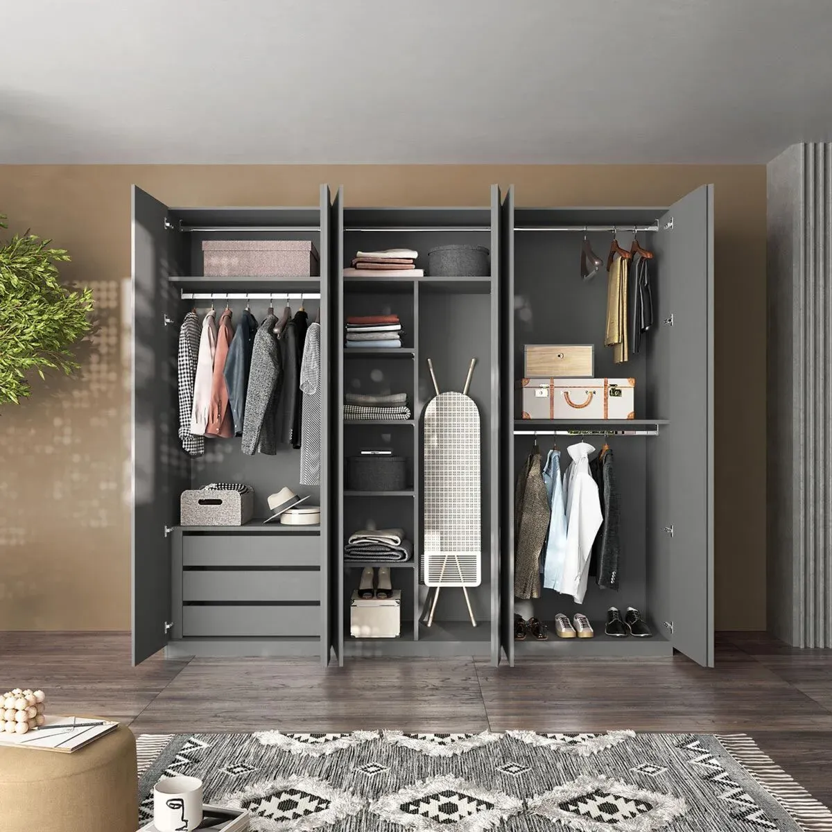Il contrasto cromatico è dato da profili e maniglie di un colore Antracite, un grigio molto scuro e profondo, che incorniciano le ante e le sezioni centrali, dando all'armadio un tocco di carattere e modernità.