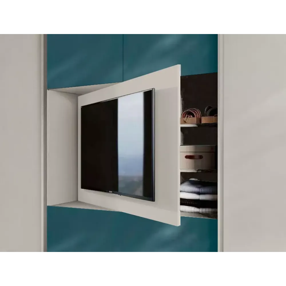 L'armadio si compone con due ante scorrevoli ed un modulo centrale attrezzato con pannello tv girevole che nascone due ripiani, due ante battenti, quattro vani a giorno inferiori ed un cestone. Questa suddivisione dello spazio assicura una totale praticità nell'utilizzo quotidiano, caratteristica che lo rende unico.