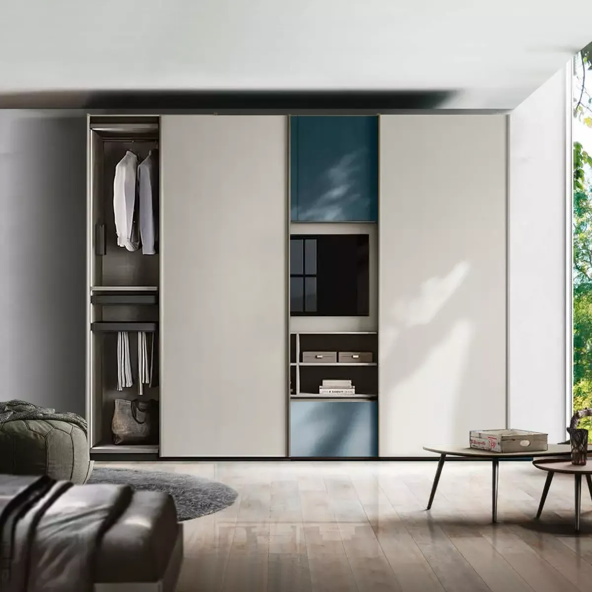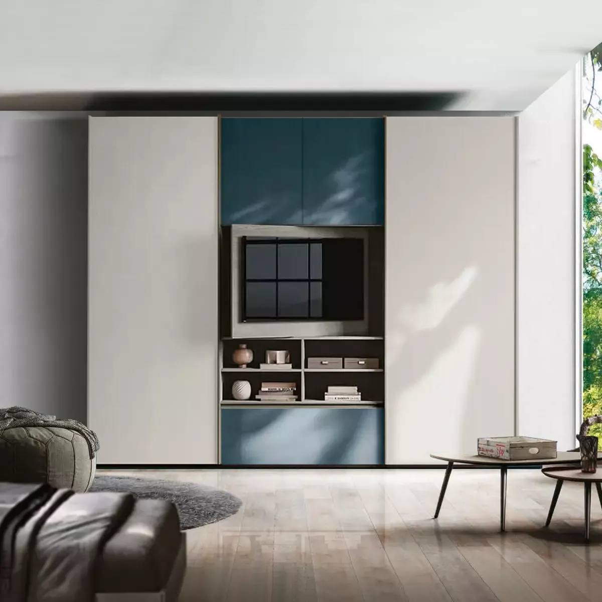 Armadio con vano tv e ante scorrevoli, finitura Petrolio e Grigio seta