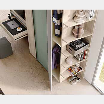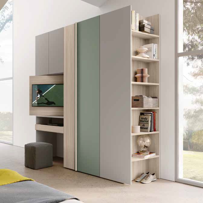 L'armadio presenta 3 finiture: una materica e lisce, pastello. L'unione di queste tinte genera calore e fascino, per questo l'armadio diventa una perfetta soluzione d'arredo sia per ragazzi che ragazze. Il Grigio seta si alterna all'Agave donando armonia e carattere all'ambiente. A completare la composizione è l'Olmo natura, finitura materica che riporta l'eleganza senza tempo del legno. Caratteristica fondamentale è la presenza di una scrivana estraibile, ideale per ambienti dalle dimensioni limitate che non possono ospitare una scrivania fissa.