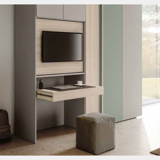 L'armadio moderno è dotato di un vano tv orientabile per assicurare una corretta visione della televisione in tutte le direzioni con libreria a 2 ripiani nella parte posteriore, una scrivania estraibile che assicurà la massima praticità durante lo studio e modulo con libreria a 6 ripiani.