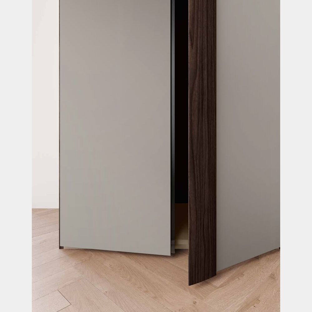Eleganza e sobrietà sono i tratti principali che contraddistinguono l'armadio. La delicata finitura in Grigio seta sposa il Noce moro creando un contrasto originale e ricercato che dona carattere all'armadio. Le maniglie facilitano l'apertura garantendo una superficie liscia e donano un impatto visivo elegante ed essenziale.
