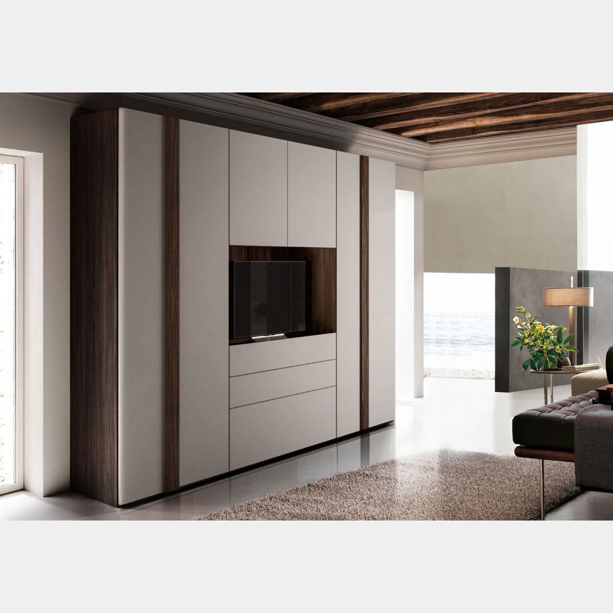 Armadio con vano Tv, 6 ante battenti e 3 cassetti in Grigio seta e Noce moro