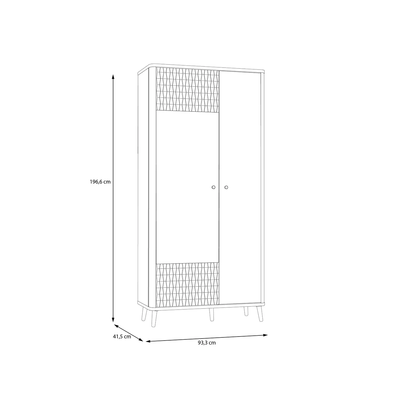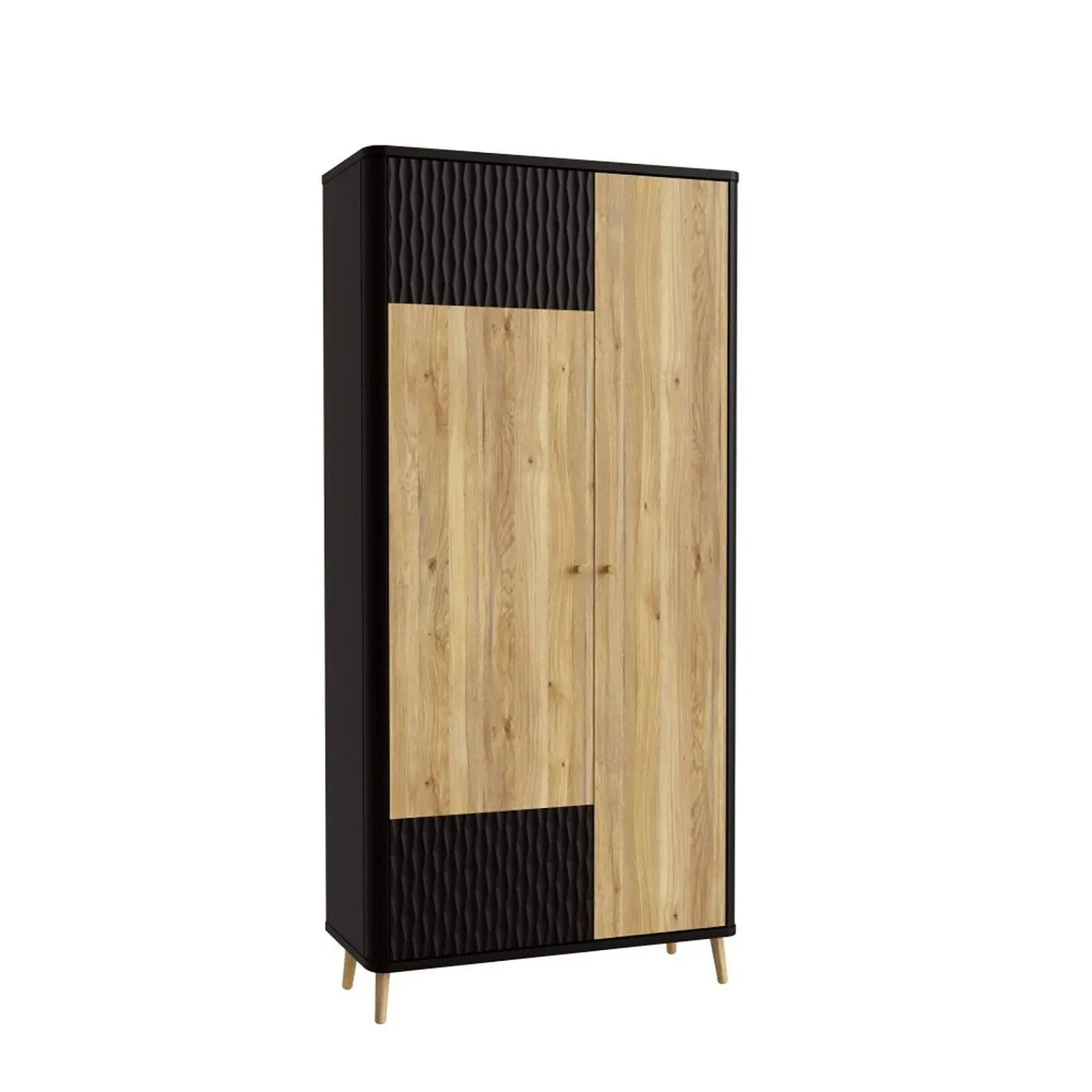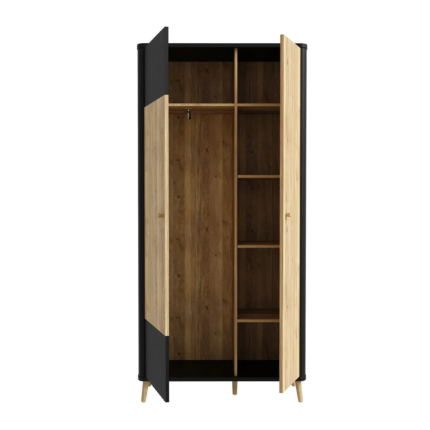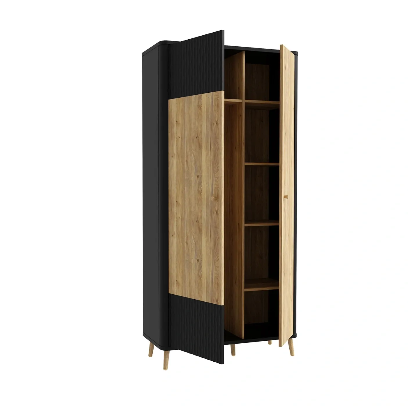 L'armadio presenta una combinazione di finiture a contrasto. La tinta Rovere Mauvella, con le sue venature naturali, conferisce calore e un aspetto rustico, mentre il Nero aggiunge un tocco di modernità e grinta.