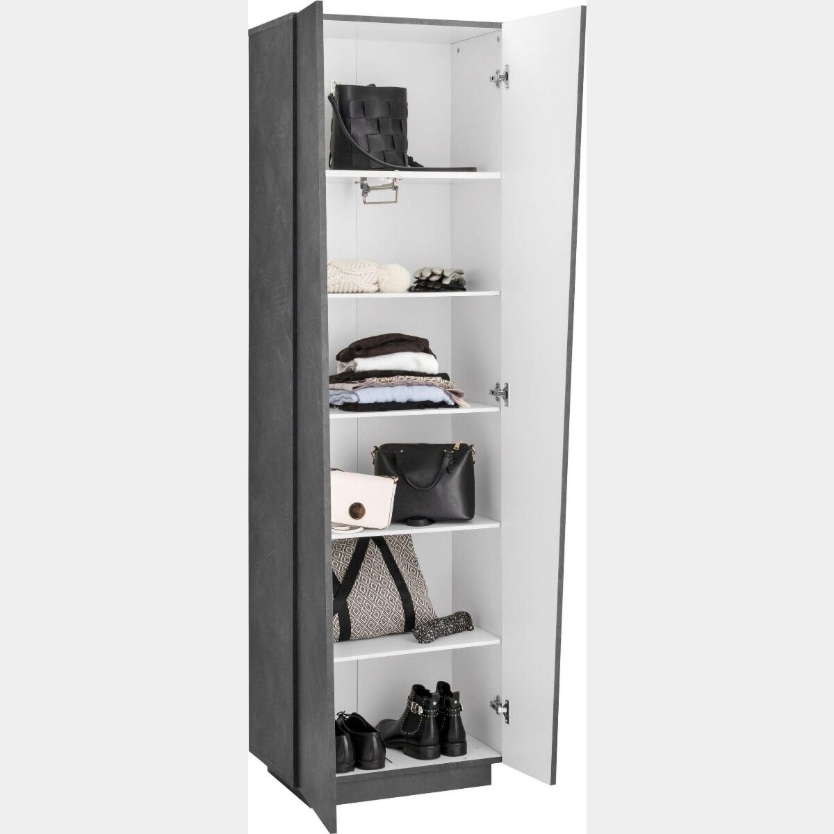Pratico Armadio 2 ante battenti con struttura e frontali in ardesia, adatto a camere moderne o di design. Utile anche come armadio destinato al cambio di stagione. L'allestimento comprende 5 ripiani.