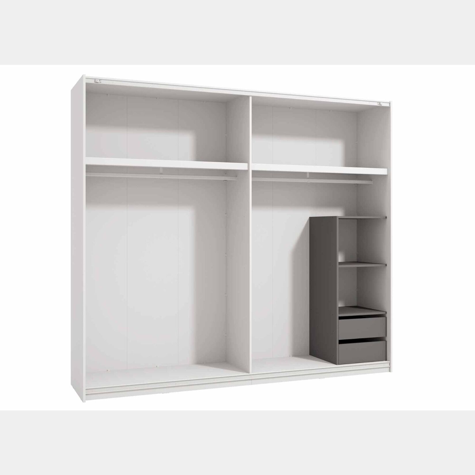 Le due ante scorrevoli sono infatti una soluzione salvaspazio e rendono l'armadio perfetto per gli ambienti ridotti, dove le ante tradizionali potrebbero creare problemi in fase di apertura.