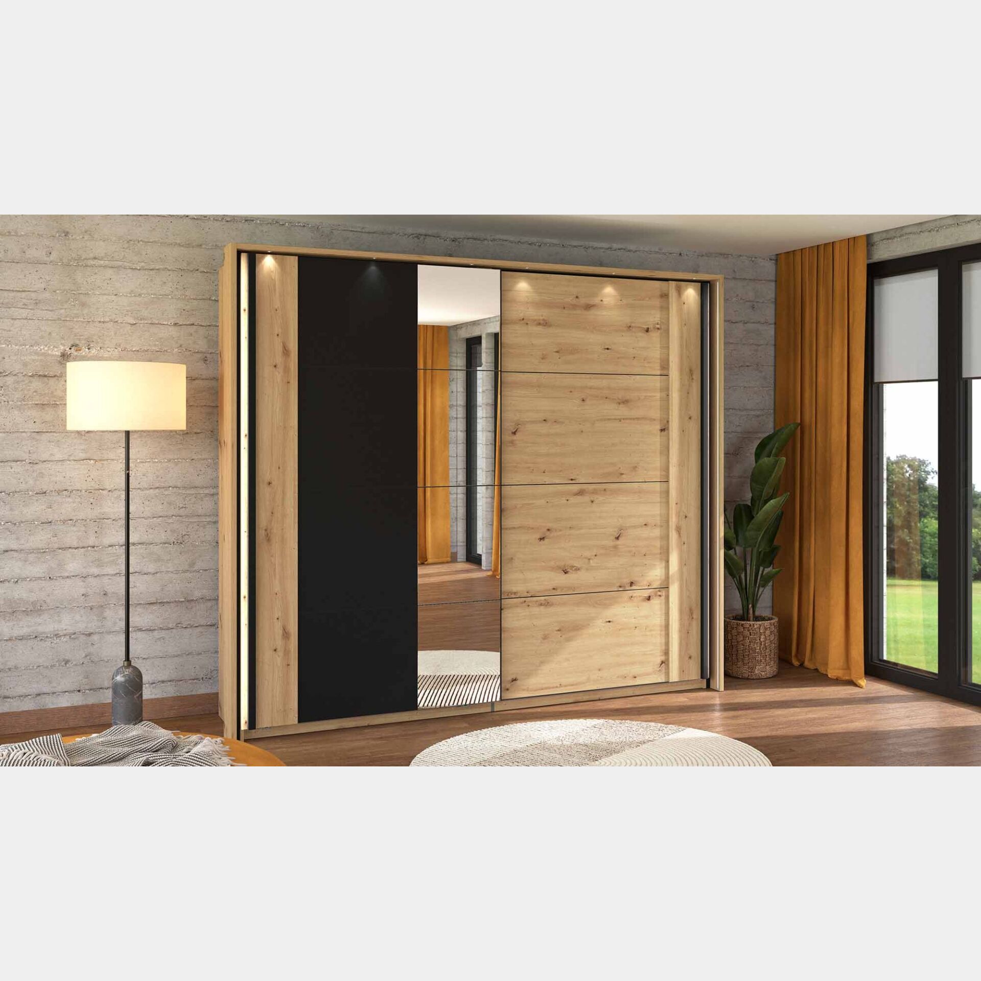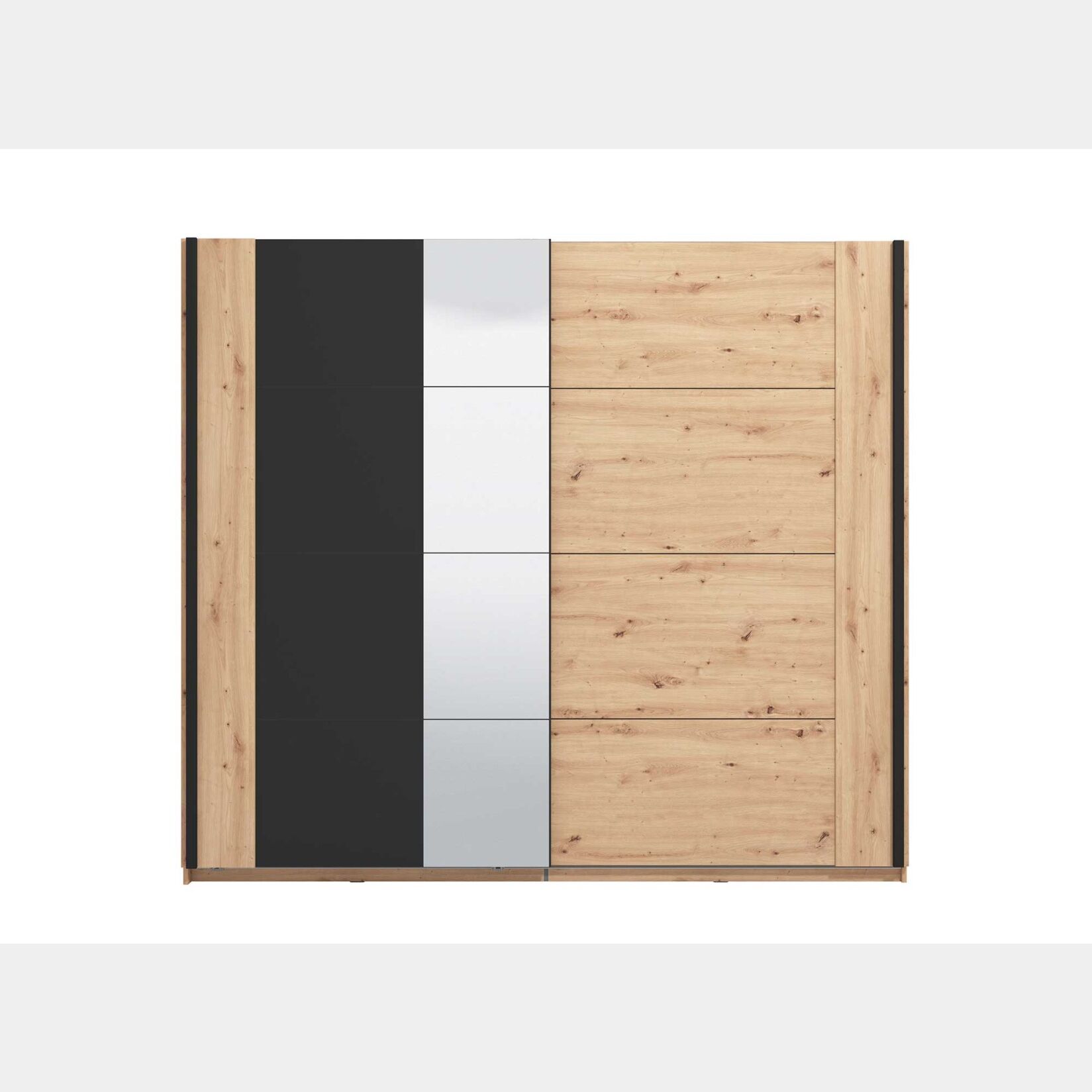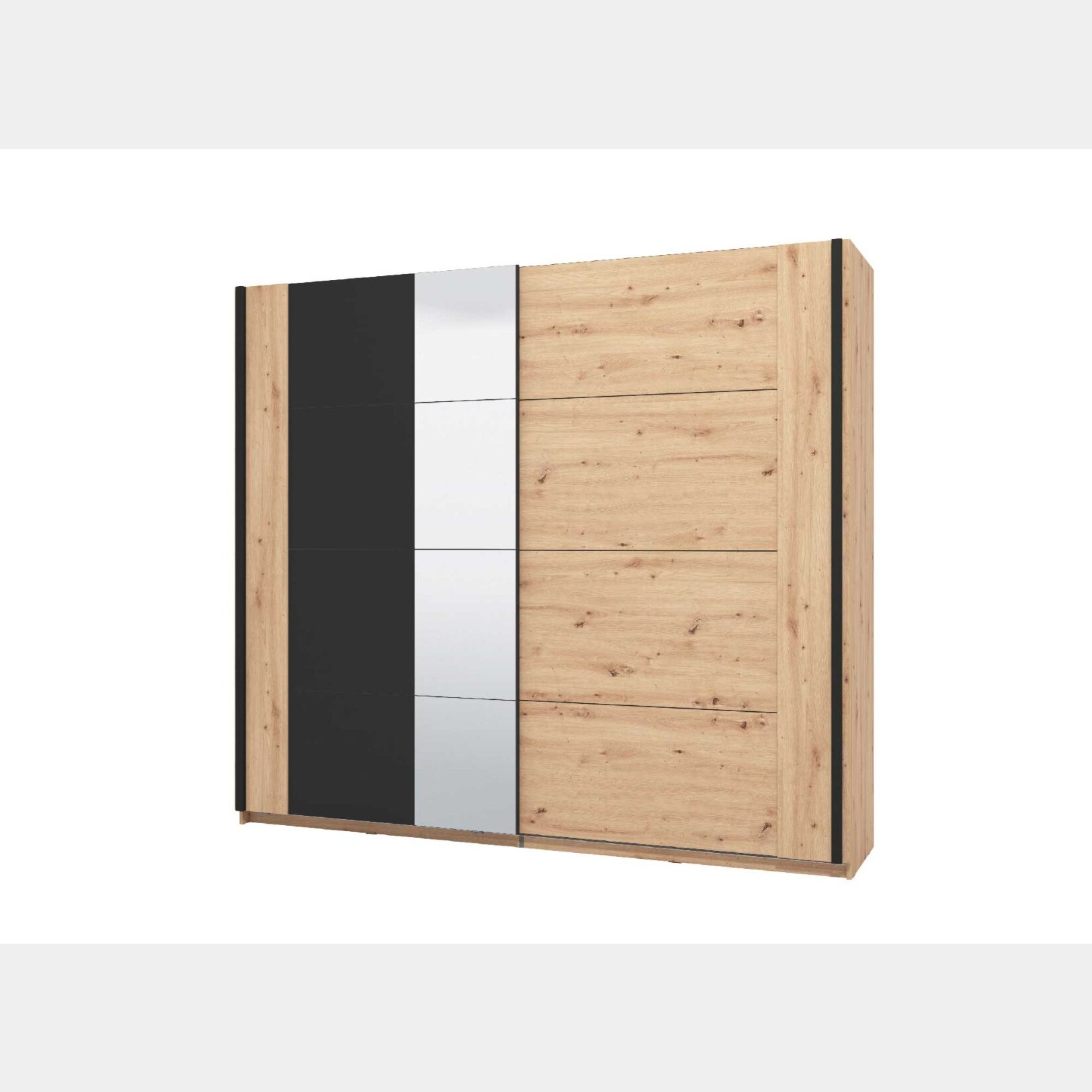 Armadio scorrevole di design moderno, con specchio, Rovere oak e Nero