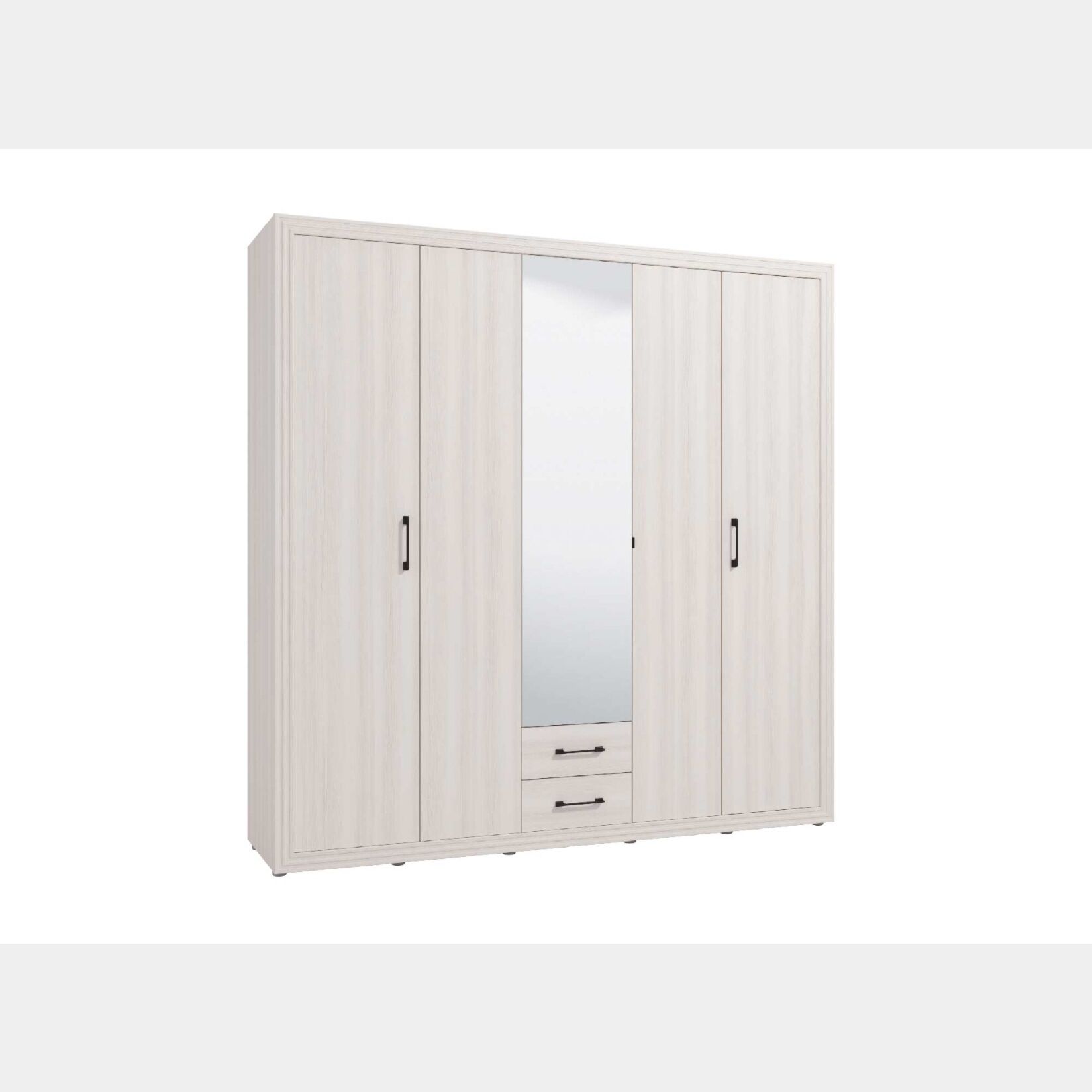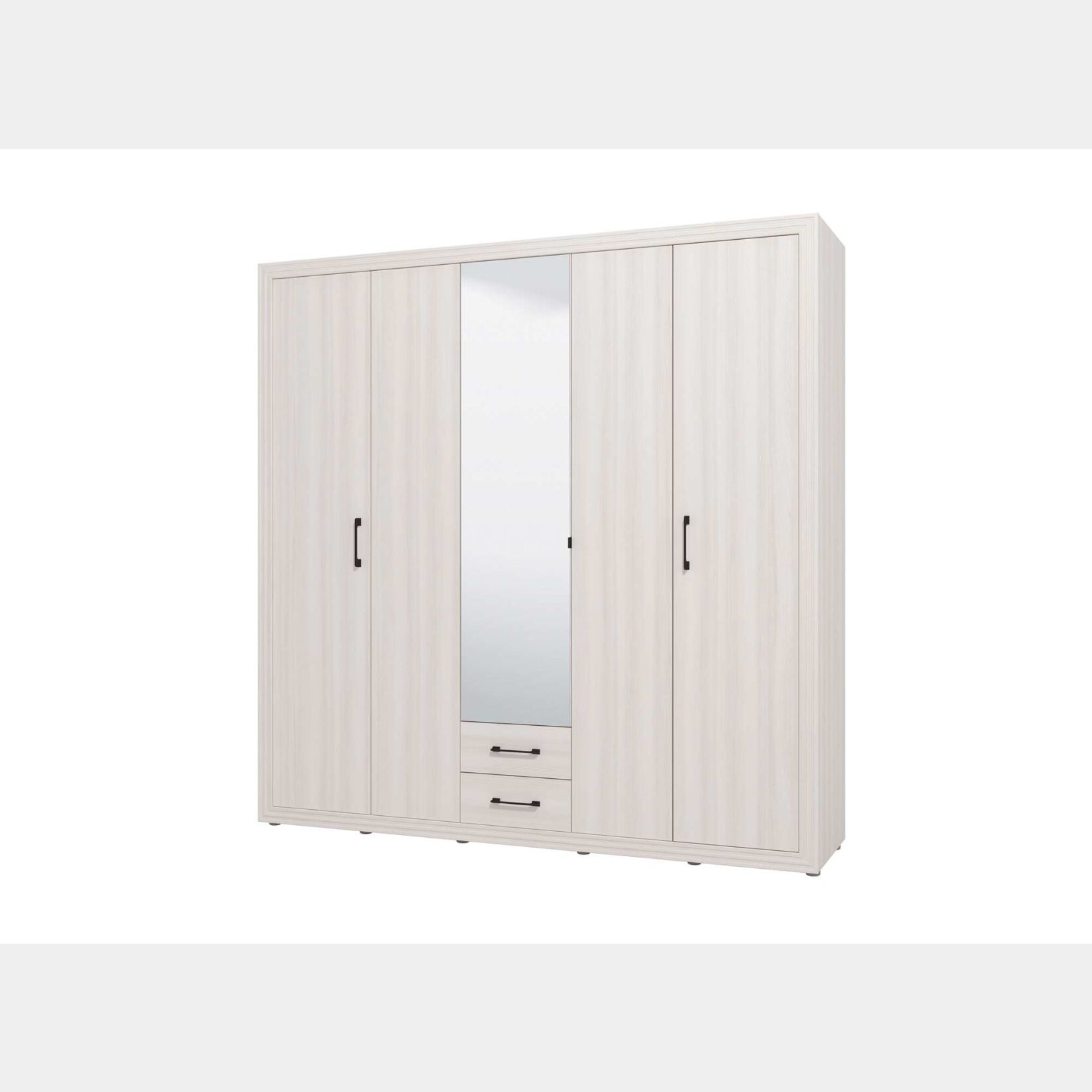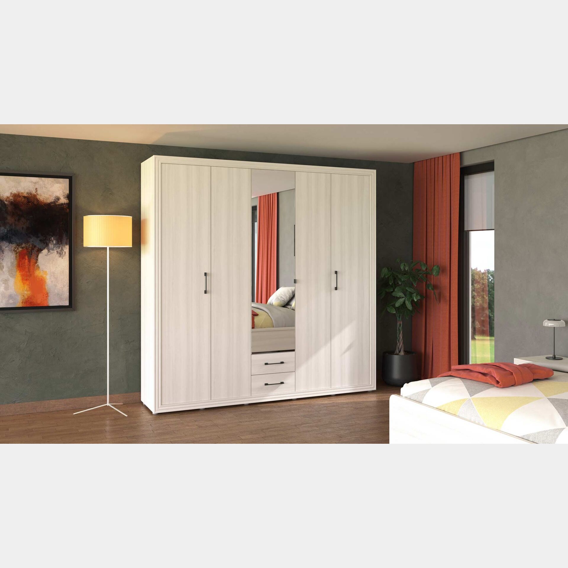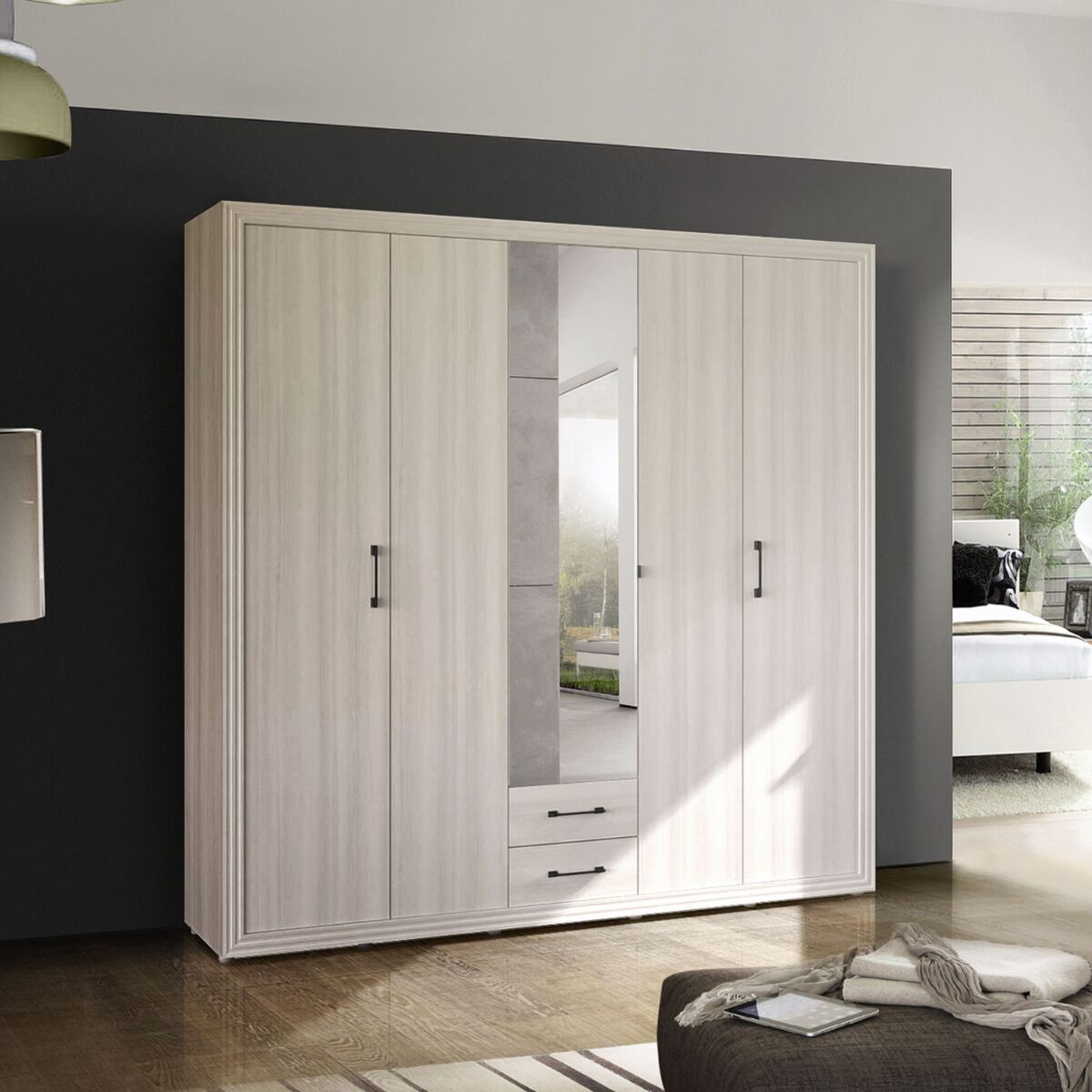 Guardaroba moderno 5 ante battenti con specchio caratterizzato da linee essenziali e un'intramontabile finitura Bianco Frassino, che lo rendono estremamente versatile e adatto a qualsiasi stile d'arredo.