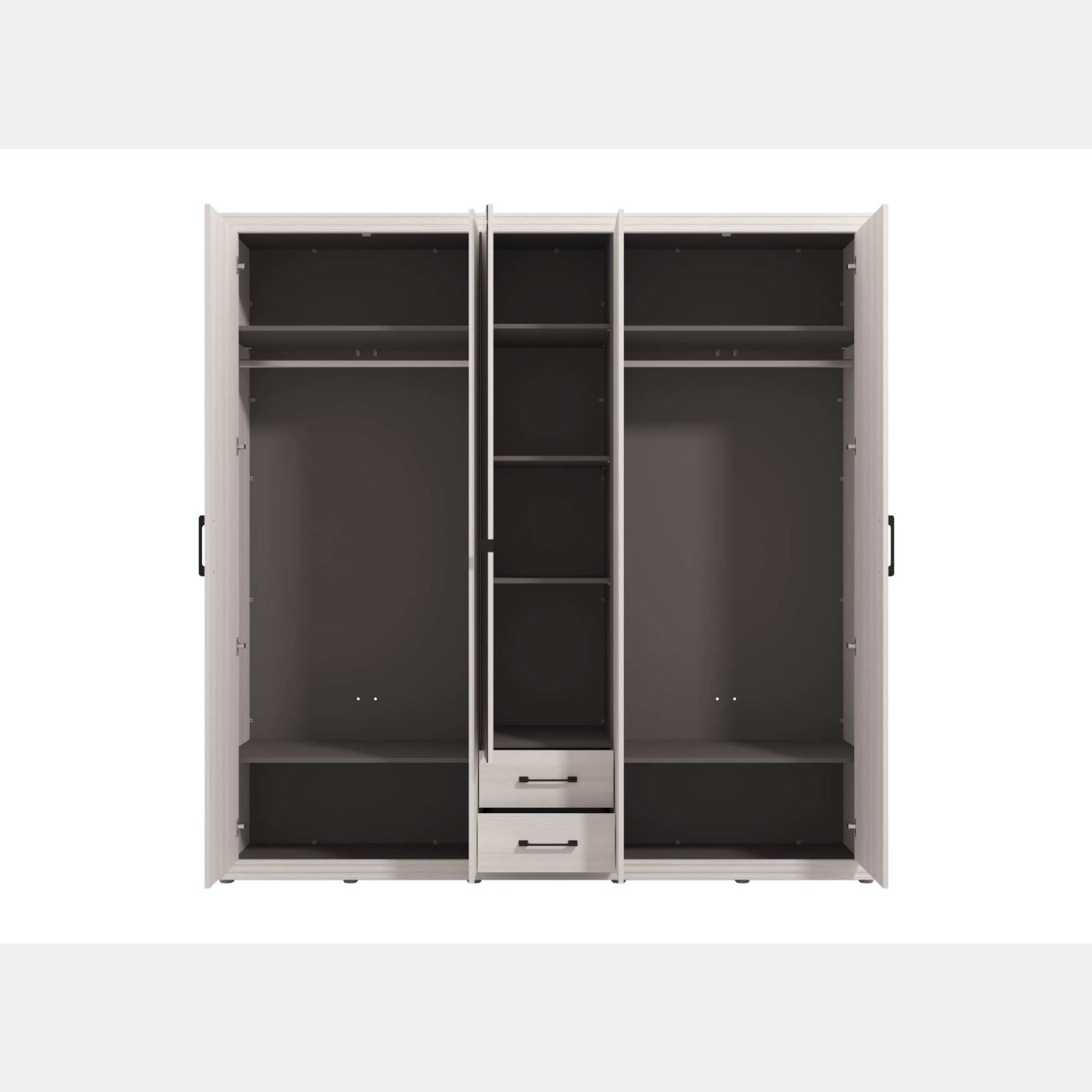 E' dotato di 5 ante battenti e internamente è diviso in tre scomparti, internamente ha 7 ripiani e 2 tubi appendiabiti.