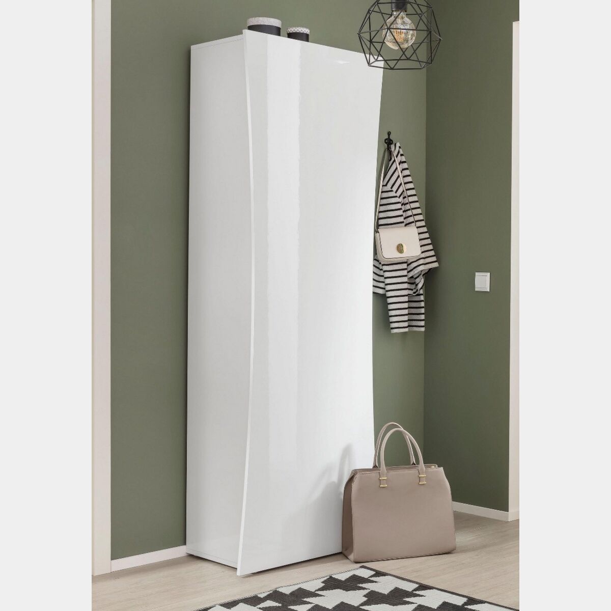 Il Armadio guardaroba, linea Arco. L'armadio da ingresso moderno è in finitura bianco laccato lucido. Ha la struttura larga 53 cm, mentre il pannello con due curve a forma d'arco sui lati è più grande di 10 cm.