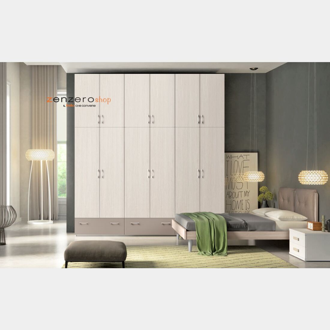 Armadio H.291 con 12 ante battenti e 3 cassetti in finitura Corda e Larice bianco