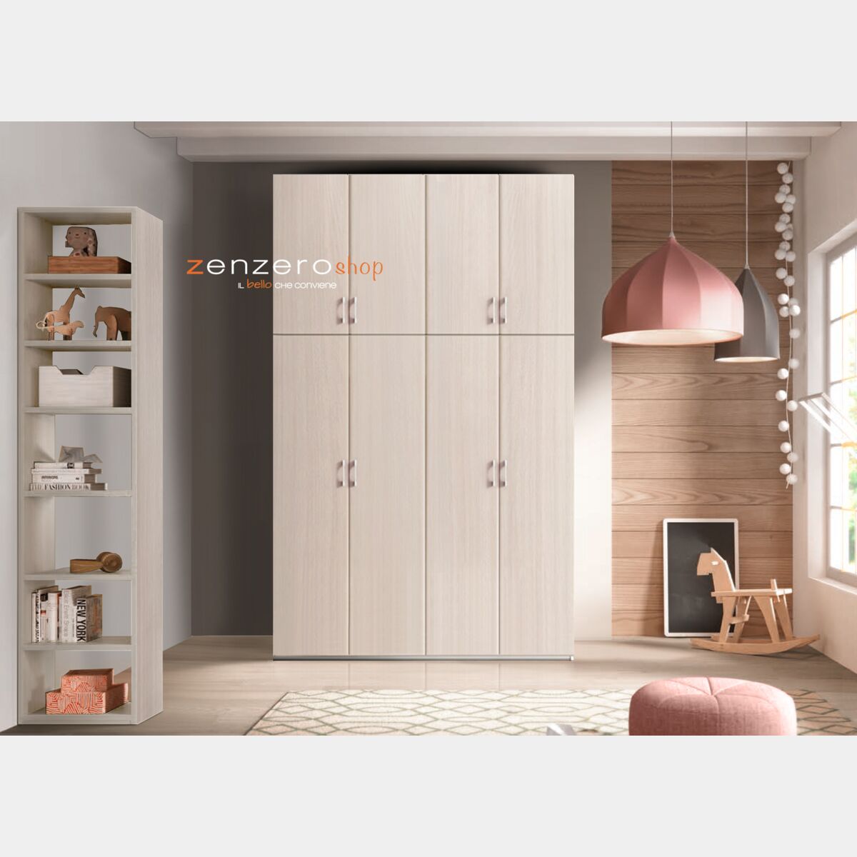 L'armadio è composto da 8 ante battenti, l'allestimento di base comprende 4 tubi appendiabiti, uno in ogni vano, sono disponibili diversi optional come altri ripiani e cassettiere per adeguarlo alle proprie esigenze.