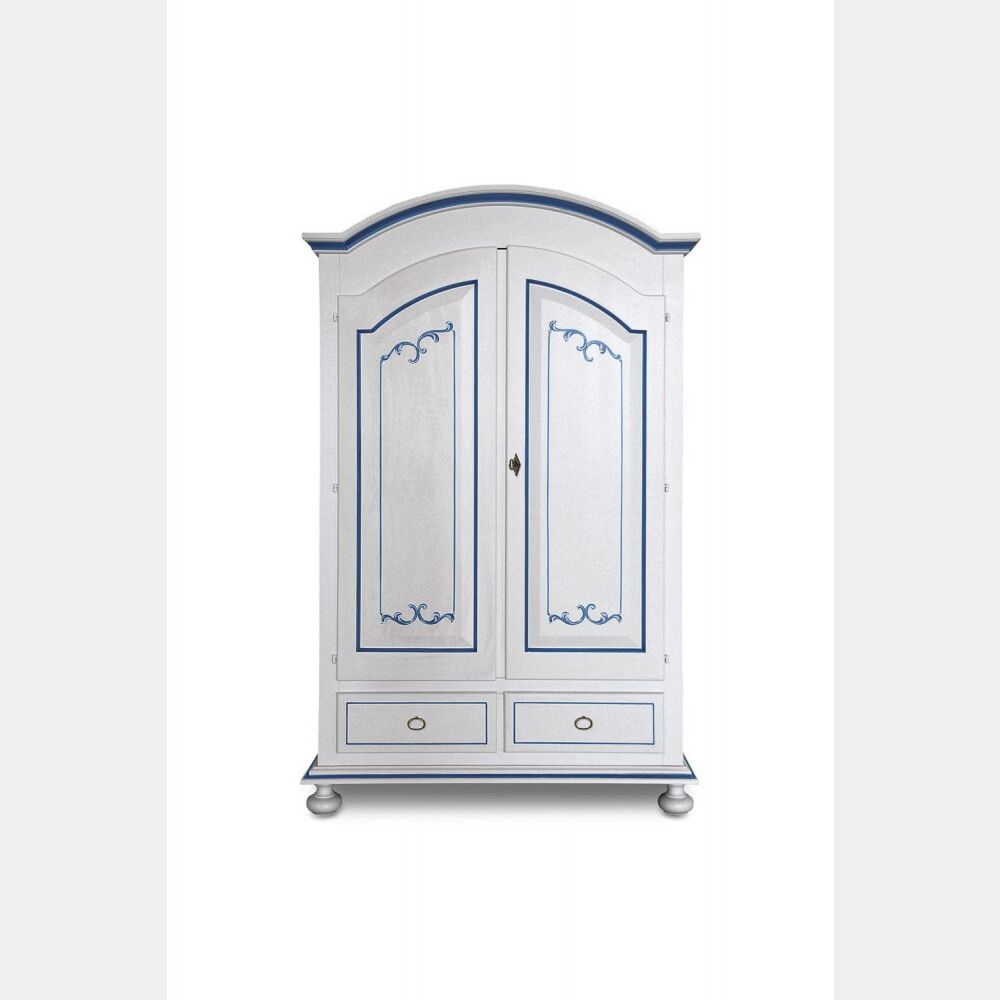 Armadio in legno, laccato bianco, con filetti blu, a cappello tondo in stile Classico, vanta un design spiccatamente tradizionale perfetto per gli amanti dell'arredo elegante e intramontabile.