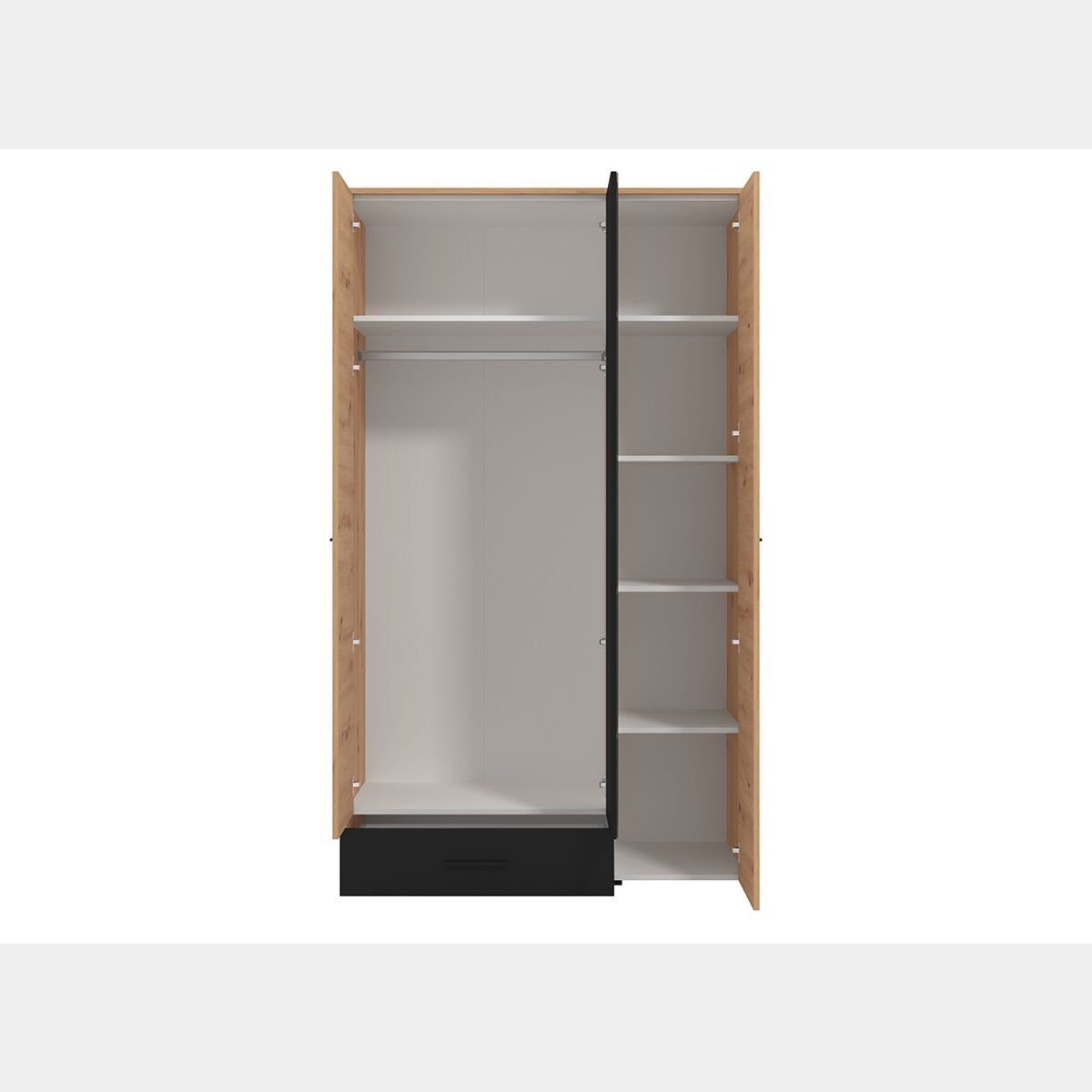 La calda finitura Rovere viene spezzata da una intensa tonalità nero presente nel frontale del cassetto e in parte dell'anta con specchio. Queste finiture, abbinate alle sottili maniglie scure assicurano all'armadio uno stile industry, ideale per chi desidera un complemento d'arredo semplice, ma di carattere.