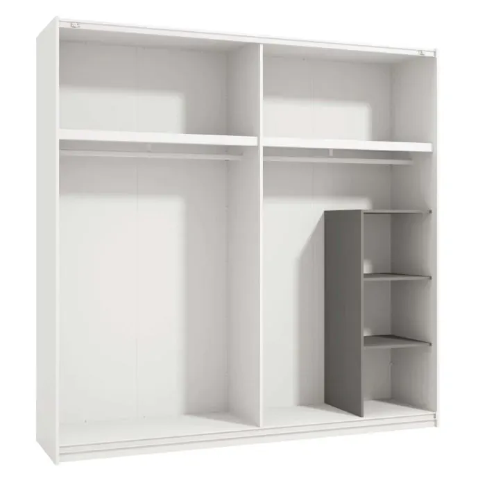 Di base vengono forniti due ripiani interni e due tubi appendiabiti, è possibile personalizzare l'armadio richiedendo ulteriori ripiani e il passepartout con luci led.