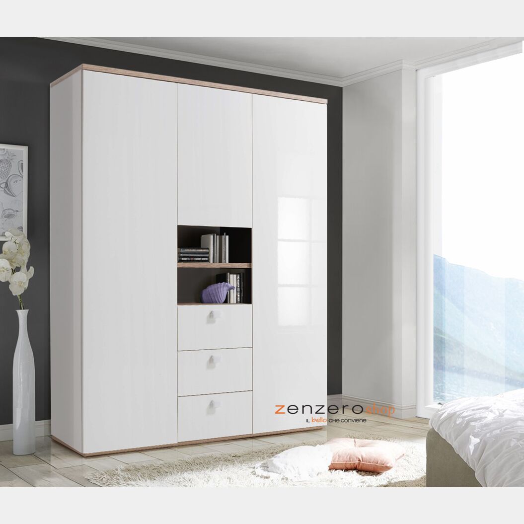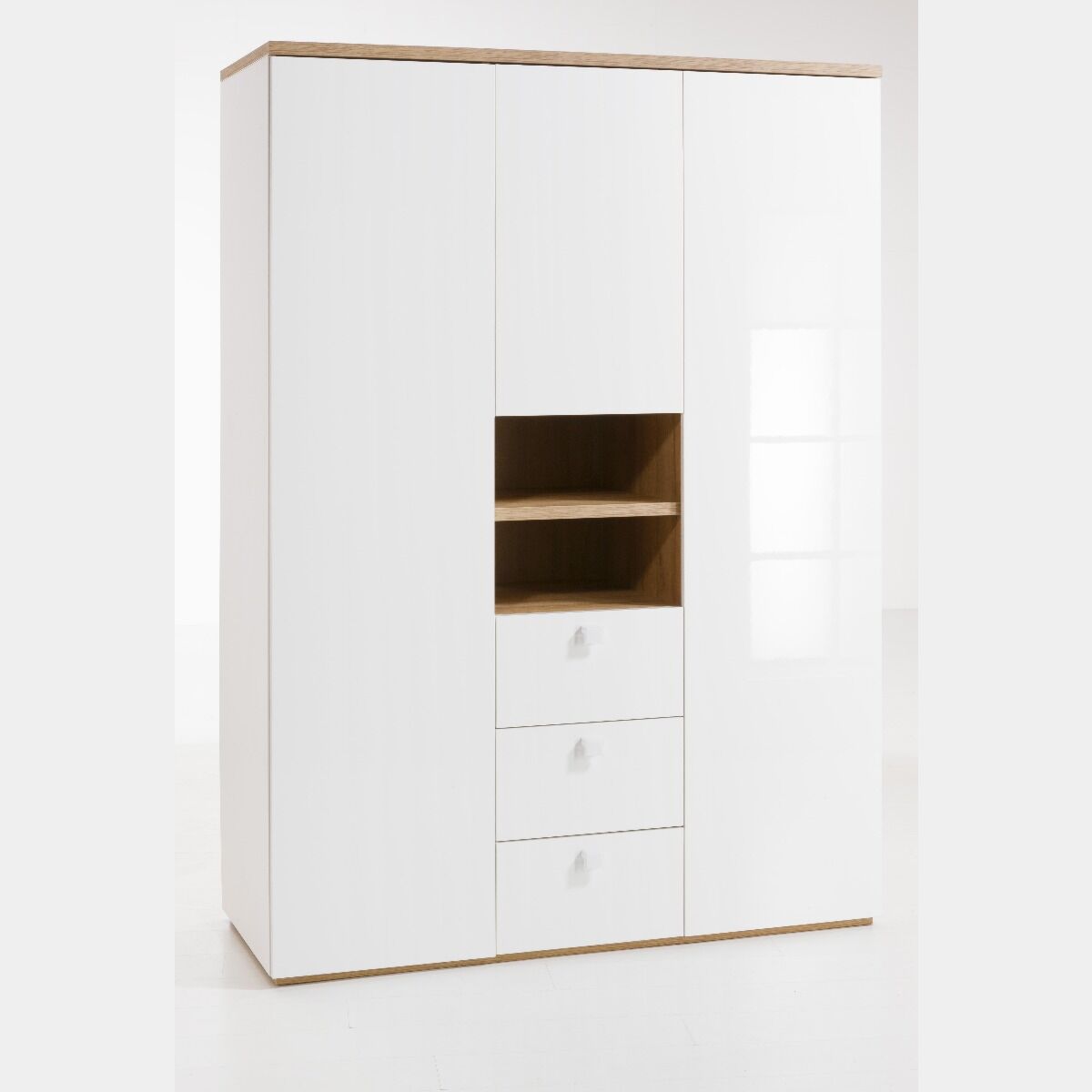 Armadio con 3 ante battenti e 3 cassetti in finitura Bianco laccato e Rovere