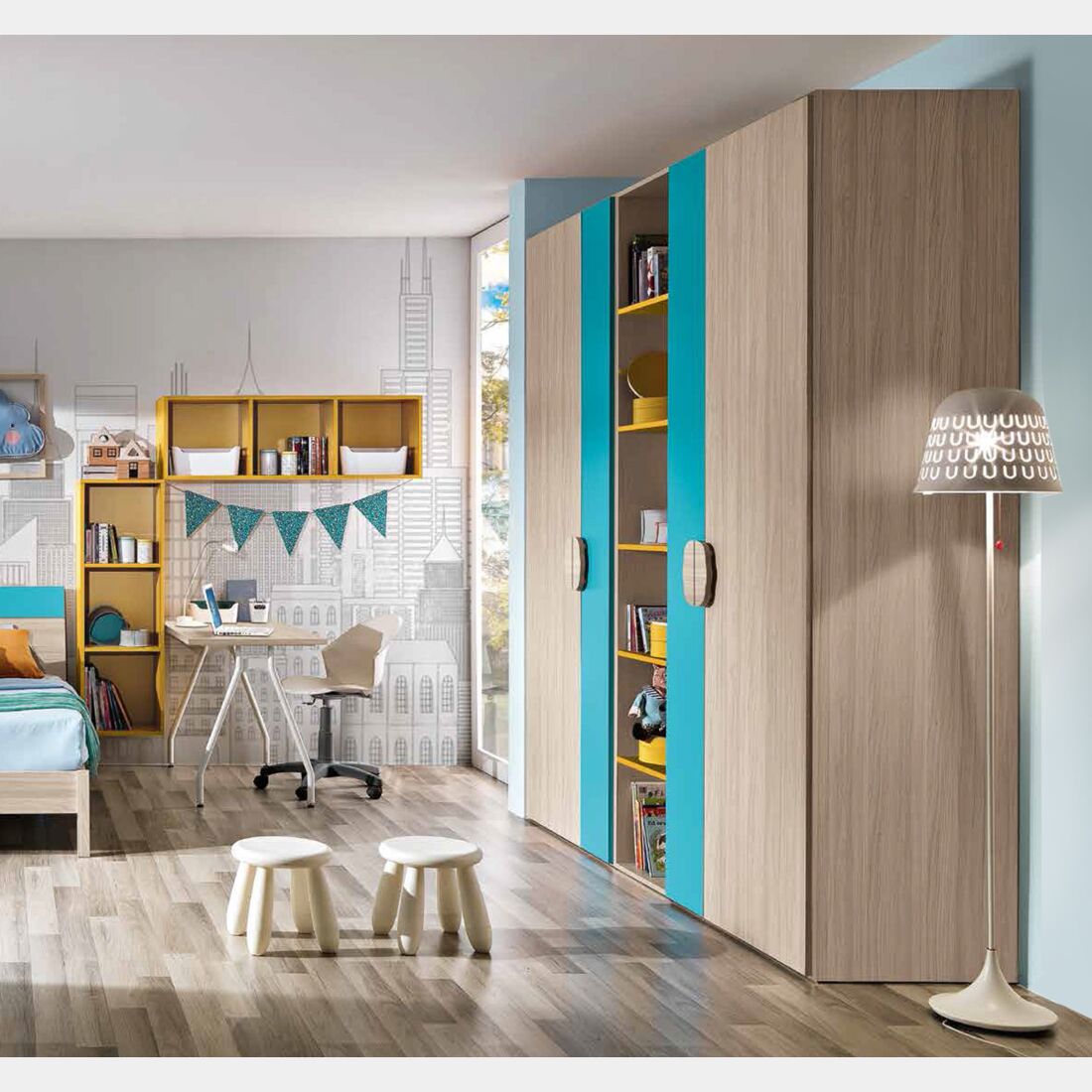 Armadio a 4 ante battenti, con colonna / libreria 6 vani a giorno, struttura dell'armadio in olmo, le ante sono di colore olmo, turchese, mentre le mensole dei vani a giorno sono di colore giallo. All'armadio è possibile aggiungere come optional dei ripiani aggiuntivi (fino a due) e delle cassettiere (fino a due). La finitura dell'armadio può essere cambiata sia nella scocca che nei frontali delle ante.Splendido e robusto armadio MADE IN ITALY prodotto da primaria azienda del settore arredamento moderno.Finiture: Struttura: OlmoColori frontali: Olmo, Turchese, Giallo