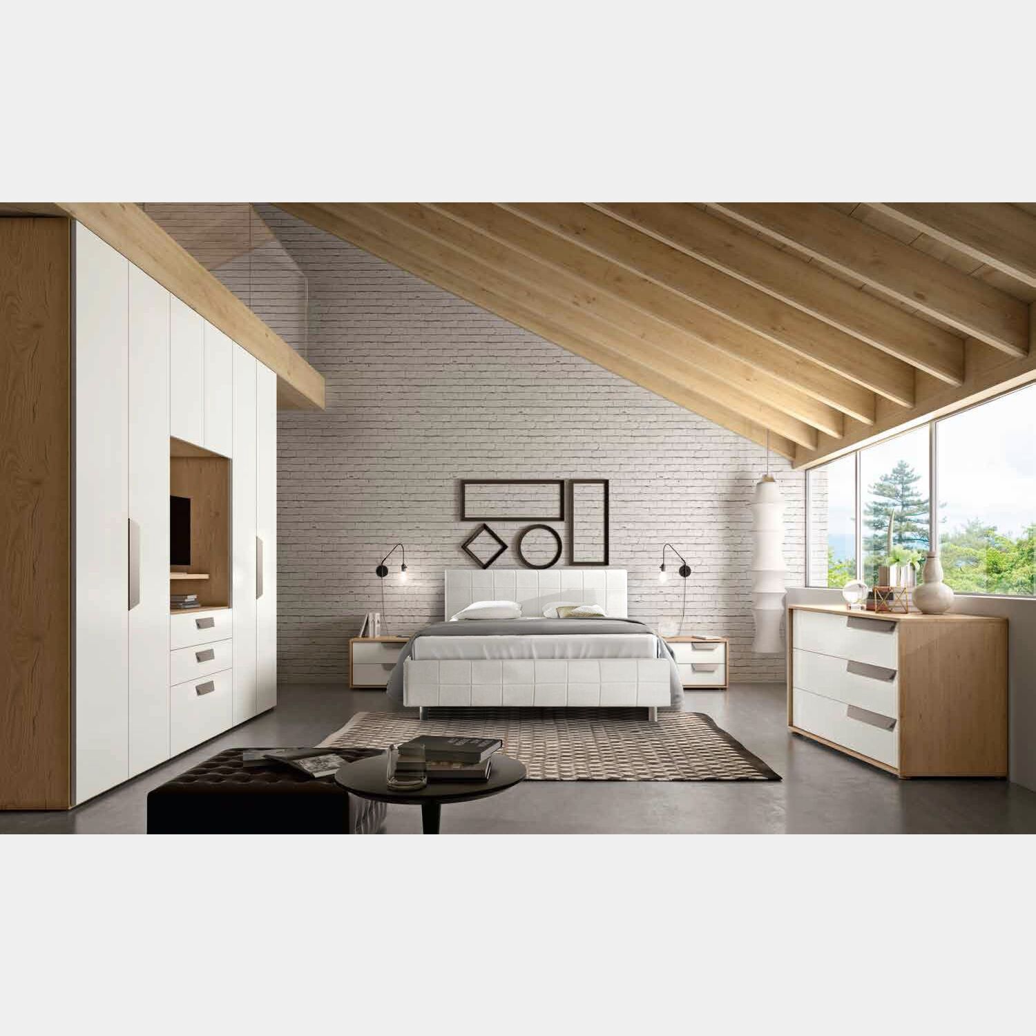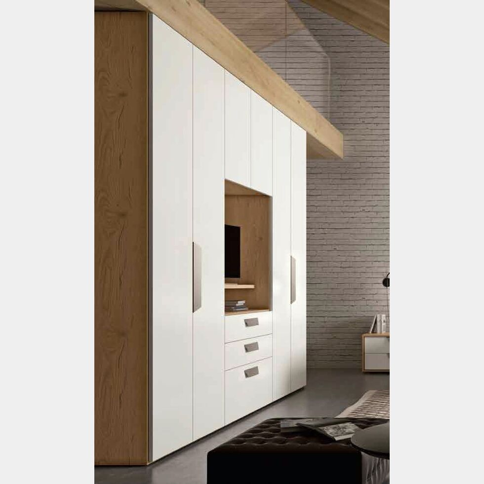 L'arredo notte è composto da 4 ante alte 214 cm + 2 ante posizionate sopra il vano TV. Sotto il pratico vano TV ci sono 3 cassettoni con maniglia.