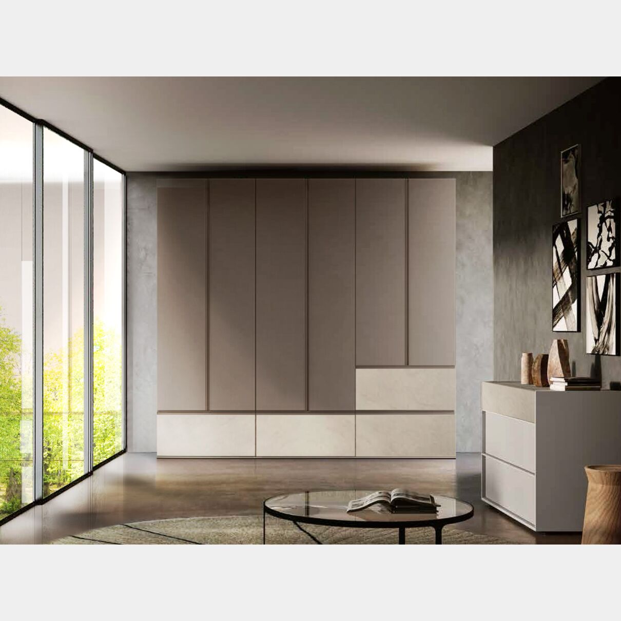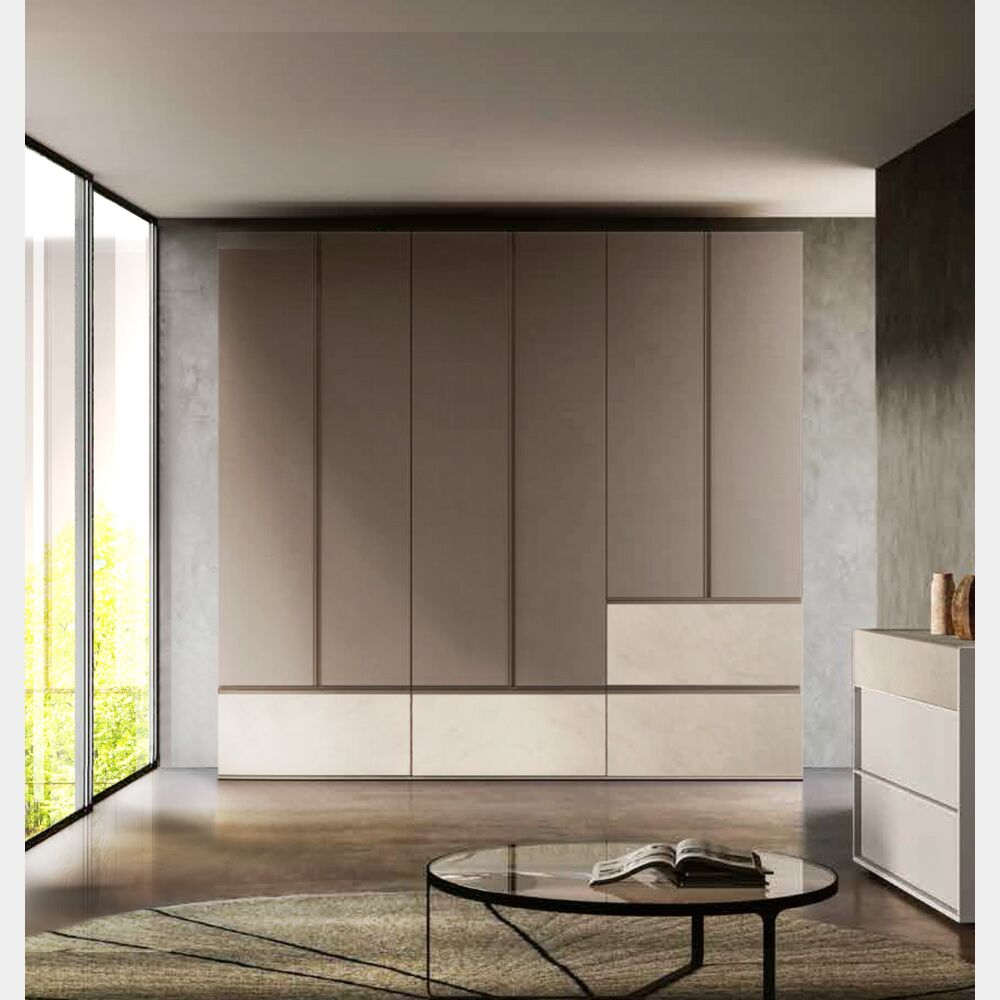 Armadio moderno battente 6 ante 4 cassetti, in finitura Argilla e Bronzo