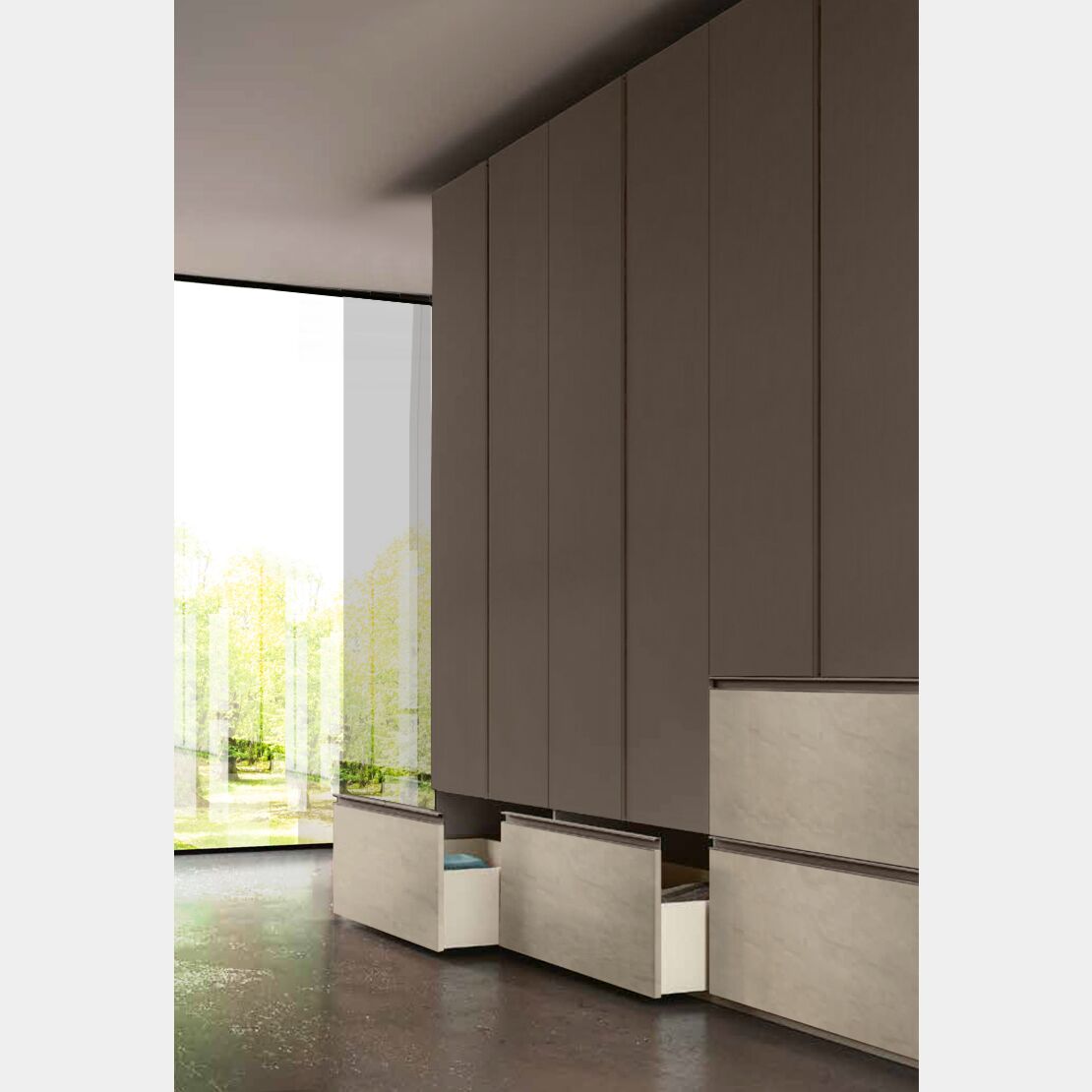 Anche le finiture giocano un ruolo importante nell'arredo della camera da letto, in questo caso Bronzo e Argilla creano un netto contrasto per mettere in evidenza cassetti ed ante, le pratiche ed eleganti maniglie a gola assicurano un presa sicura, per offrirti il massimo confort nell'utilizzo quotidiano. E' possibile personalizzare l'armadio sostituendo le finiture, le scelte disponibili sono su nobiliati colorati, essenze e laccati (lucido o opachi).