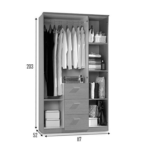 All'interno l'armadio è suddiviso in due sezioni, una in cui è presente lo spazio per gli abiti appesi (1 tubo appendiabiti) e uno spazio diviso da tre mensole. In dotazione 1 tubo appendiabiti e 4 mensole