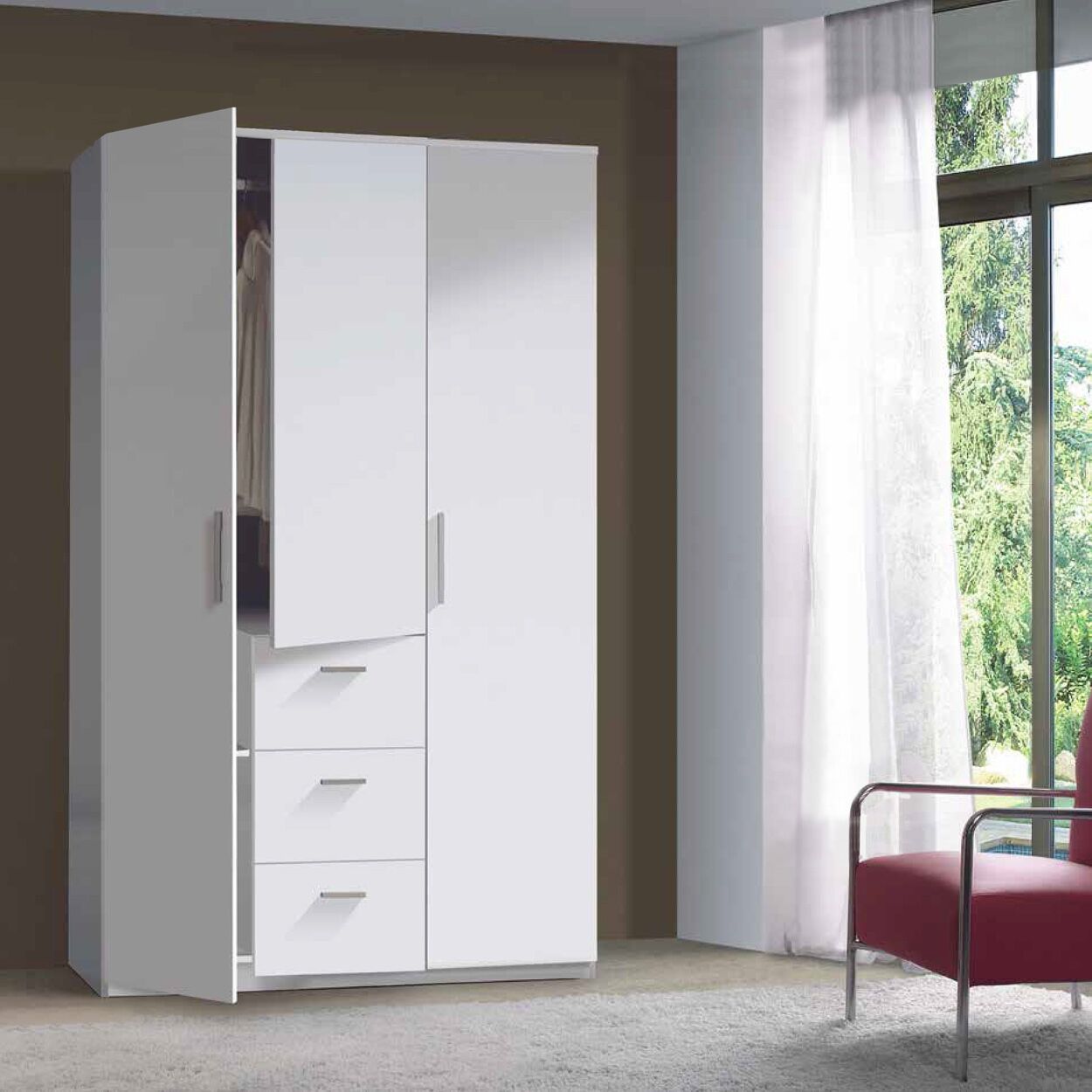 Armadio moderno, bianco lucido, 3 ante battenti e 3 cassetti